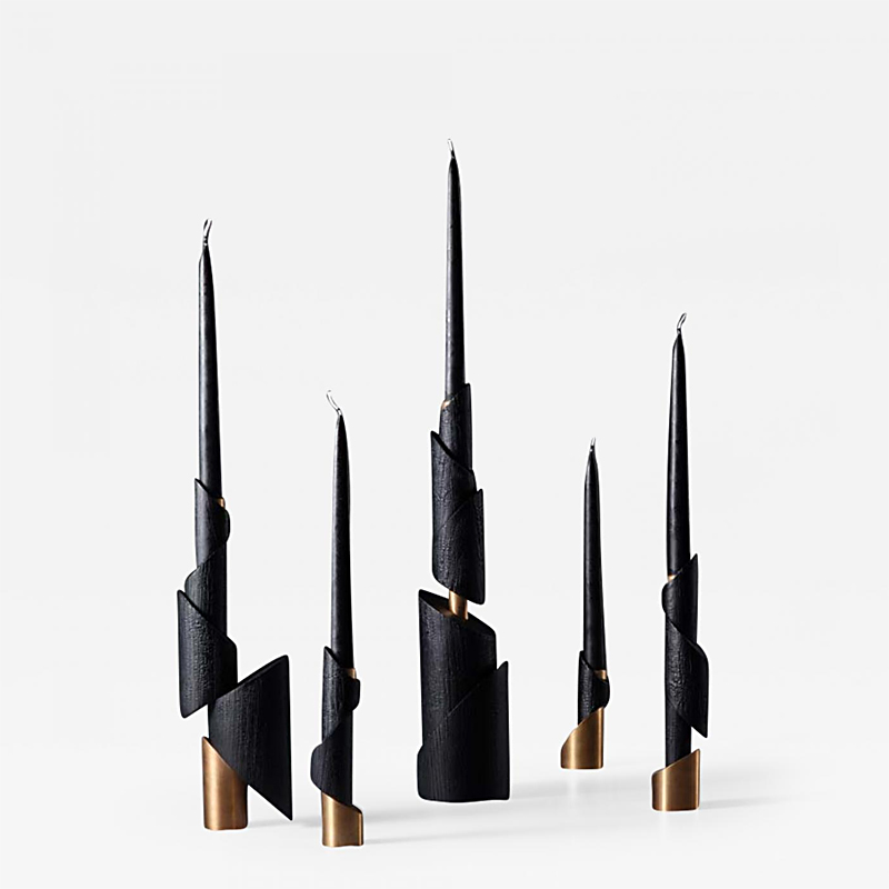 Set de bougeoirs en bois brulé et bronze massif. Chaque ensemble est composé de 5 pièces uniques réalisées à la main par des artisans français. William Guillon’s creations revolve around the notion of balance and power.