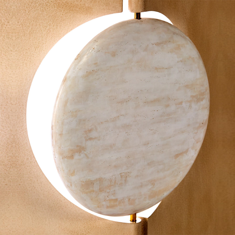 Materials : Foldable screen with trompe l’oeil paint “grain of leather”, rotating moons with trompe-l’oeil paint “travertine”, base and hinges in brass