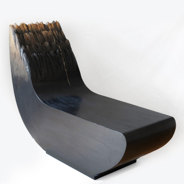 Sculpture bench in solid oak stained with Indian ink, enhanced with gold leaf. Hoon Moreau is inspired by the beauty of the elements that touch it, such as the splendors of nature, jewelry or haute couture, to create unique and functional furniture.