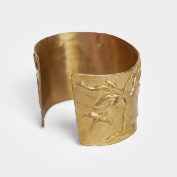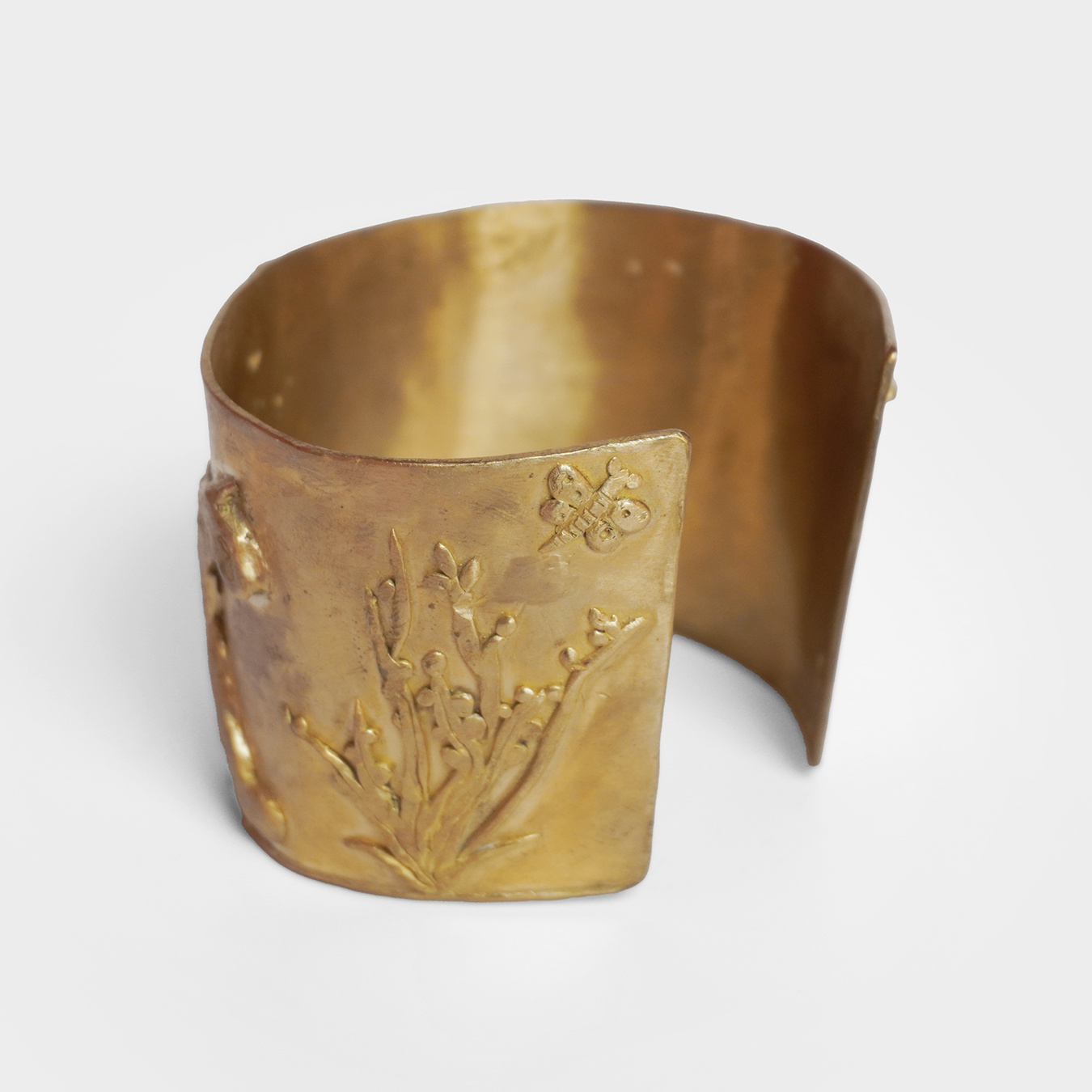Inspiration: Michelle Crouzet’s unique jewels are sculpted in bronze and are inspired by the shapes and symbols of Antiquity, between mythology, nature and archaeological traces. The rings, cuffs and pendants summon animals, fish, foliage and engraved figures, like so many timeless talismans. The material work, deliberately raw and patina, echoes buried treasures and votive adornments, transforming each piece into an object of memory and identity.