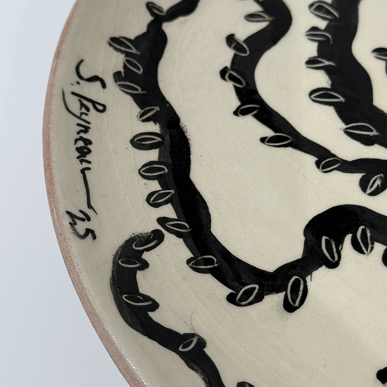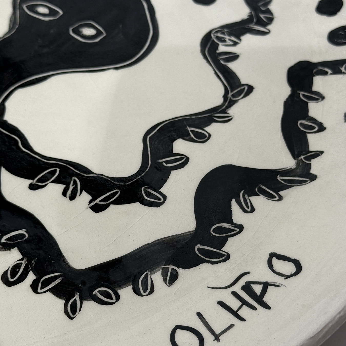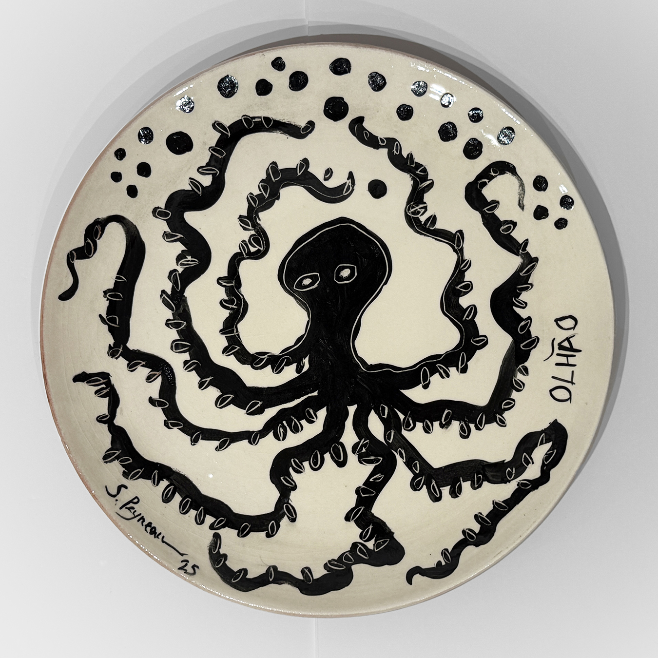 Inspiration: These unique glazed terracotta dishes are a testament to the encounter between Portuguese craftsmanship and personal artistic expression. Created in Olhão, a maritime city in the Algarve, they are the result of a creative collaboration with the potter Francesco Eugenio. Sylvie Peyneau, a French artist, develops a singular graphic language: a deep black, placed on a light enamel, gives life to an invented bestiary, stylized plants and marine forms. Each piece is decorated freehand, revealing a spontaneous line, punctuated by frieze patterns on the borders. The marine themes — birds, exotic flowers, octopus — evoke the environment of Olhão: the Ria Formosa lagoon, fishing, Mediterranean gardens.