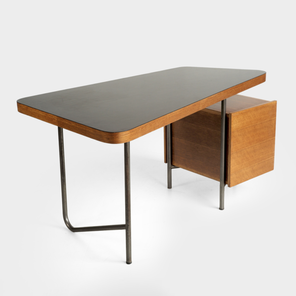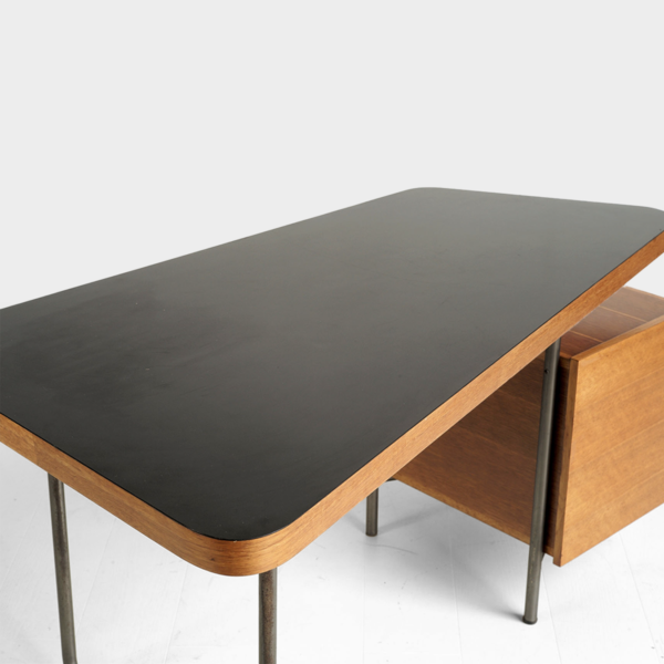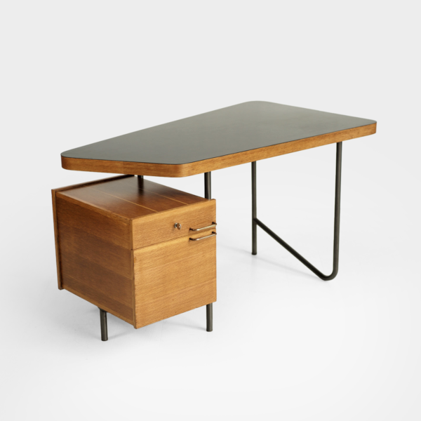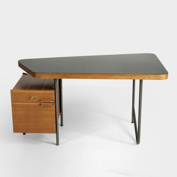 This desk illustrates the formal vocabulary of Georges Frydman, a figure of French modernist design in the 1950s and 1960s. The combination of light wood and blackened metal testifies to the influence of post-war functionalism, while asserting a sober and timeless elegance. The design of the top, asymmetrical and softened by its rounded corners, reflects the desire to combine ergonomics and aesthetics. A piece of furniture representative of modern office furniture, designed to meet the new uses of administrative and managerial work at the beginning of the Glorious Thirty.