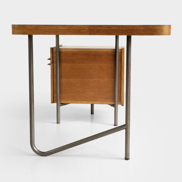Materials: Light oak veneered wood, wood veneermetal tube top, trapezoidal top with rounded corners, covered with black Formica laminate. Suspended side box with two drawers, one with lock, metal handles.