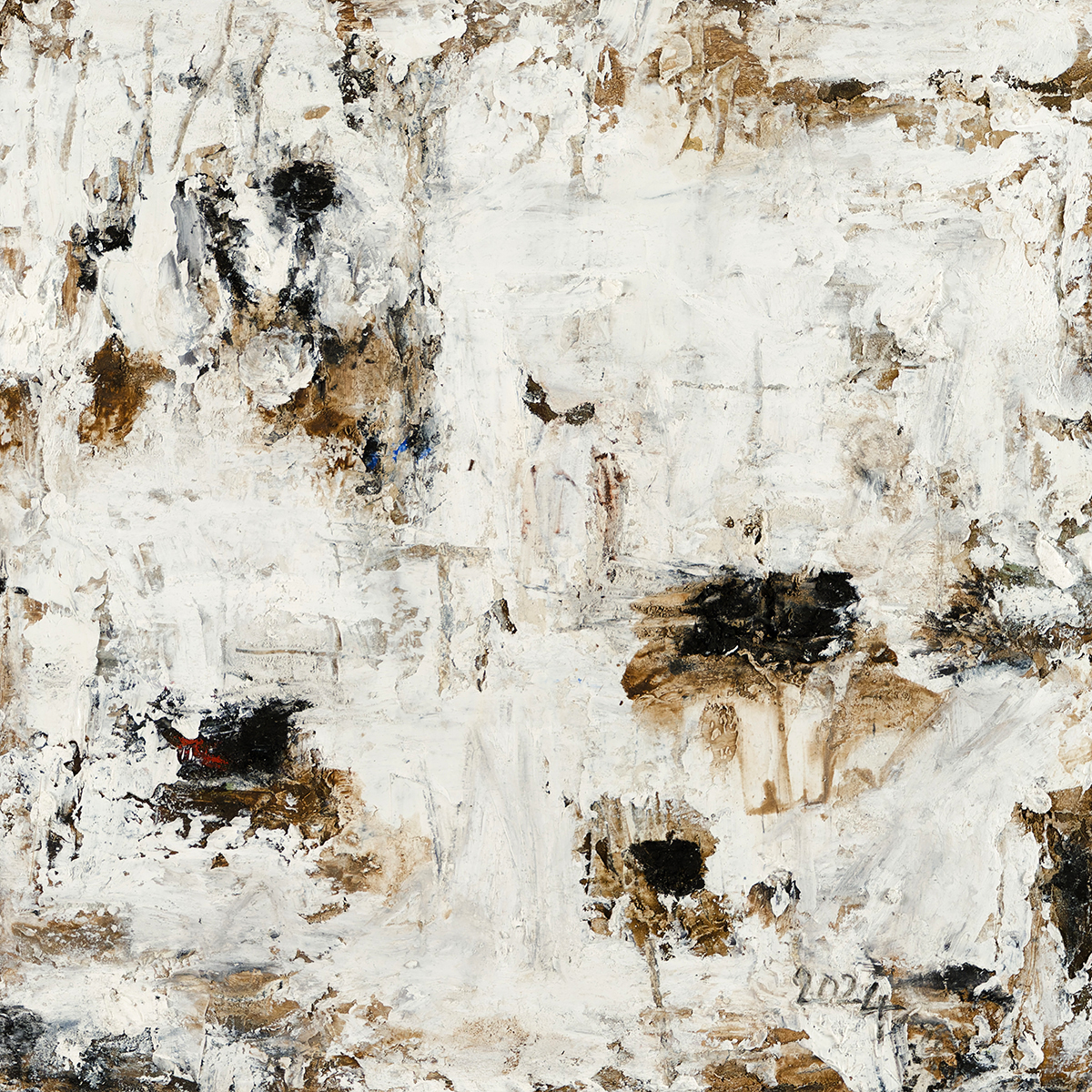 Inspiration: The series of paintings entitled “Silent Gardens” by Sylvie Peyneau invites you to a deep meditation on nature and the passage of time. These works depict gardens under the snow, symbolizing memory and natural cycles. The dominant white evokes silence and serenity, while the emerging rocks trace an introspective path. This artistic approach offers a meditative space, where the contemplation of the elements