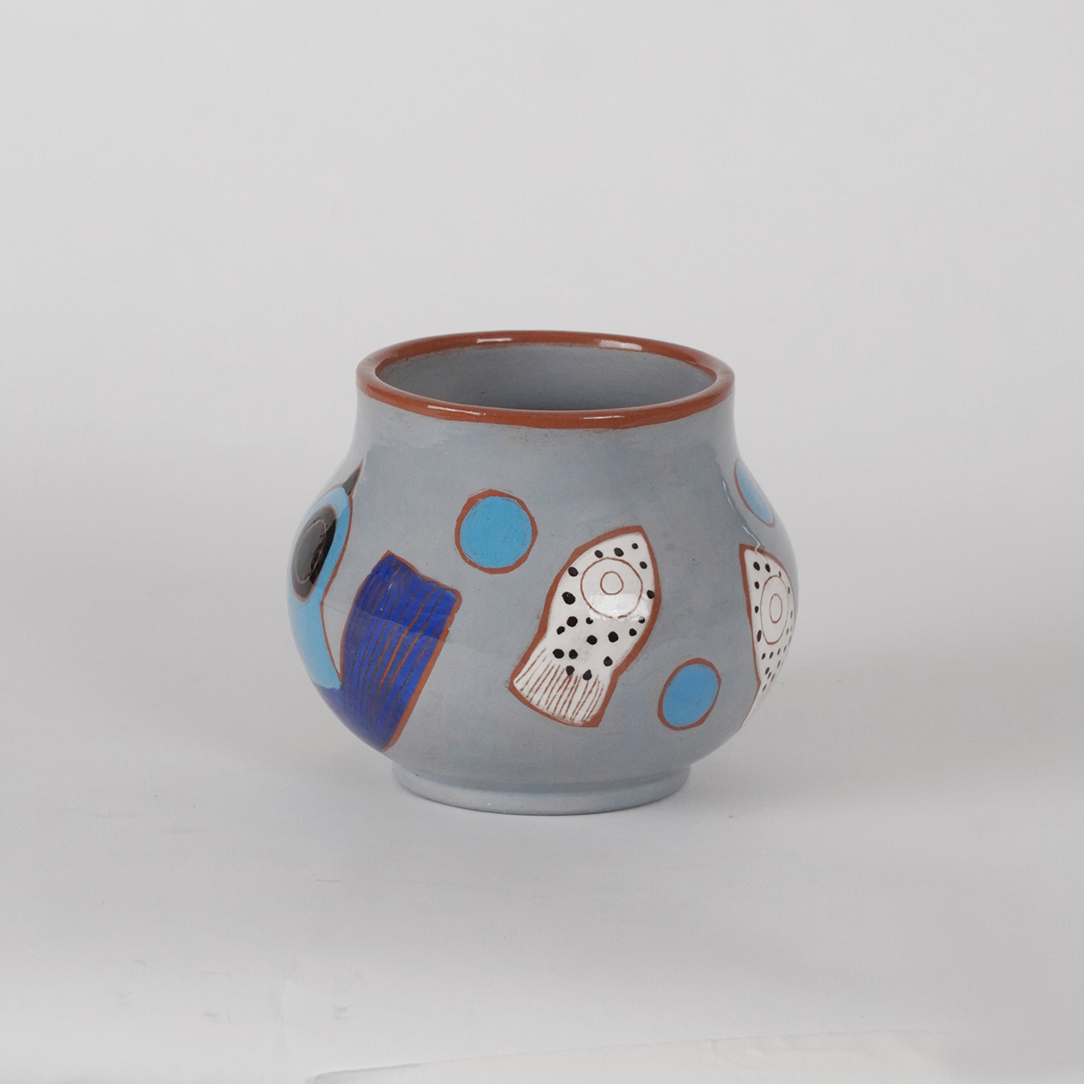 Grey and blue ball vase in red ceramic by Béatriz Garrigo, glazed and decorated with fish and birds. Unique piece, signed.