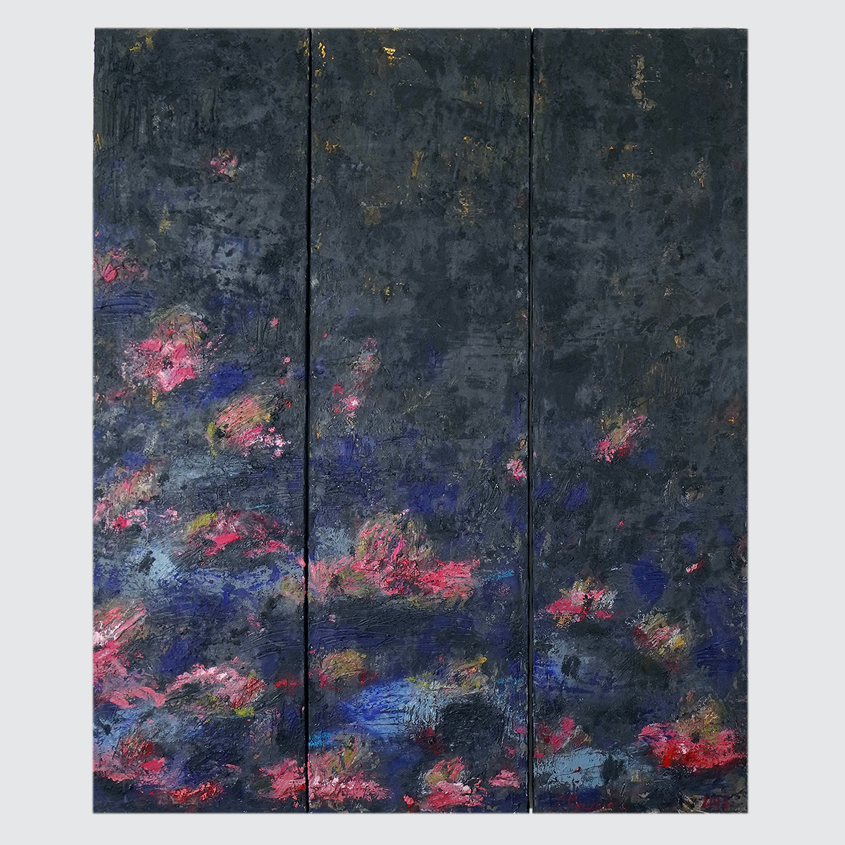 Triptych painting made in oil and pastels by Sylvie Peynaud. Japanese gardens aim to create harmony between man and nature, encouraging contemplation and meditation.