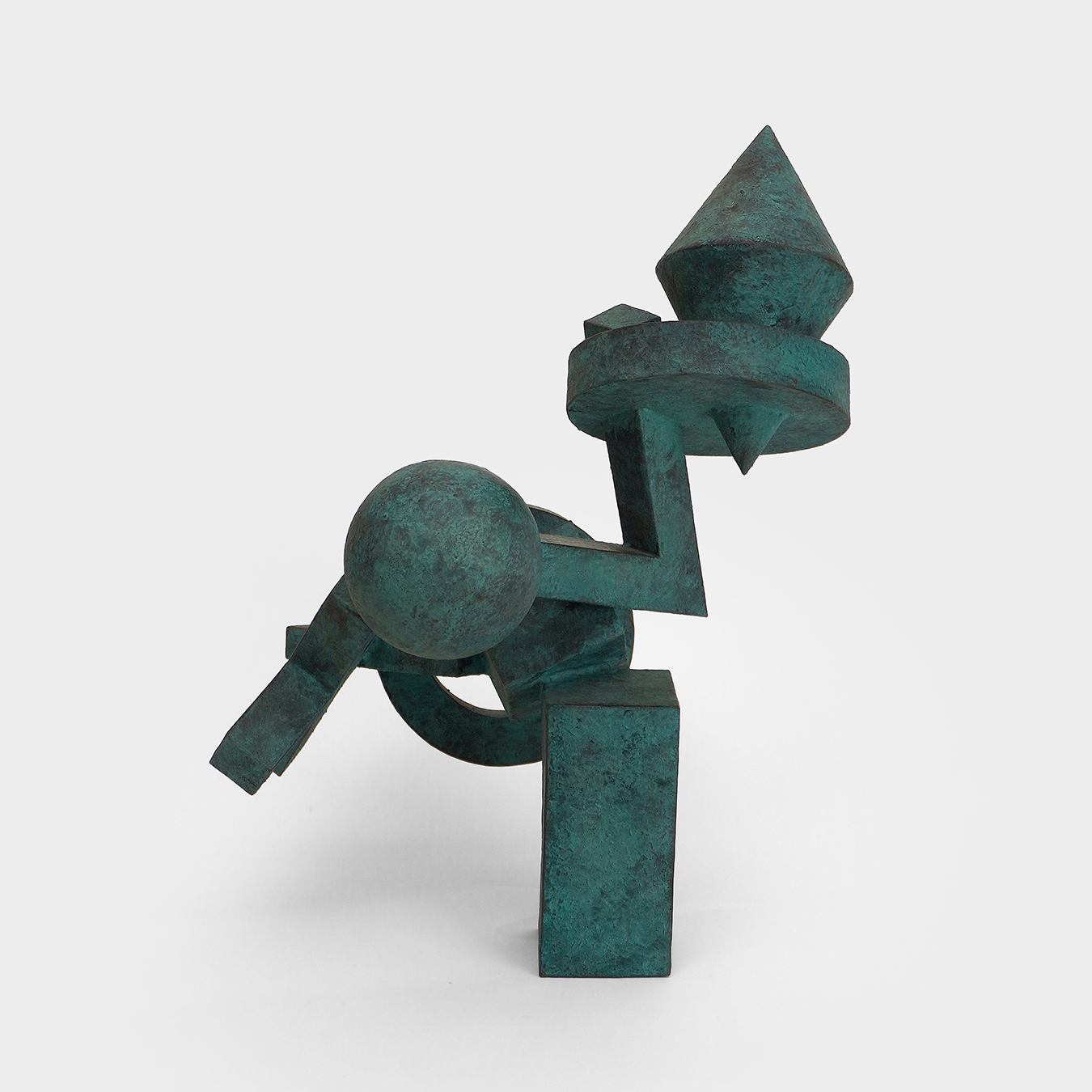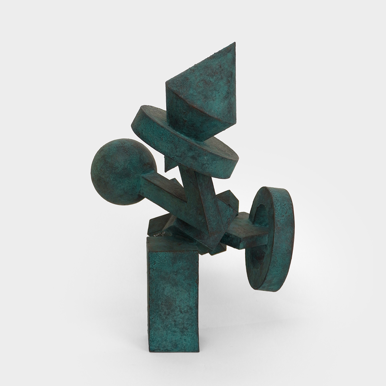Inspiration: with the juggler, Yves Pagart composes a figure that is both playful and architectural, built from simple geometric volumes — sphere, ring, cross and cone — that seem to dialogue in a delicate balance. The sculpture evokes the skill of the juggler, capable of keeping shapes and movements in suspension in a fragile moment. The bronze-green patina gives the metal a vibrant depth and brings light flush with the edges of the volumes, accentuating the almost musical character of the composition.