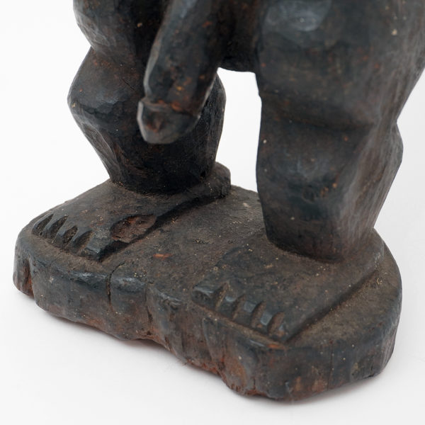 Strongly influenced by their neighbours, the Songye and the Luba, their sculptures borrow from them the stylistic codes that characterize them. This statue in particular represents the primordial ancestor, to all the canons of Luba but also Songye sculpture: the general shape, the very cubist organization of the upper and lower limbs, right down to the very flat feet, almost integrated into the base. On the other hand, the trunk is rounder, with a prominent abdomen, a symbol of prosperity and fertility, like the sex, which is very marked.