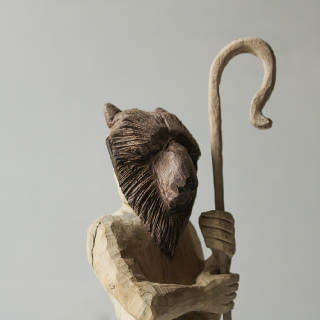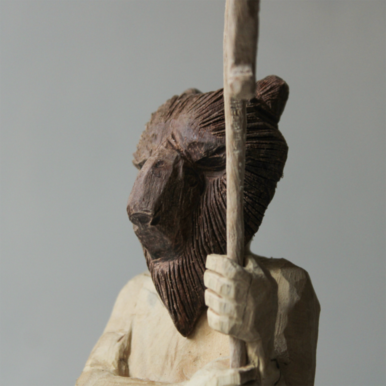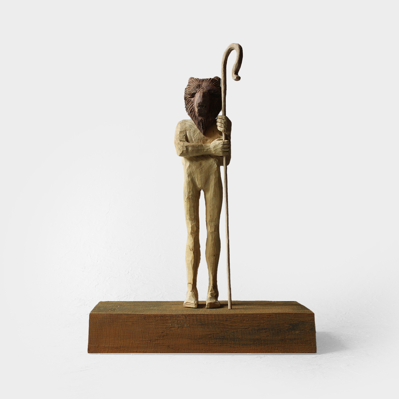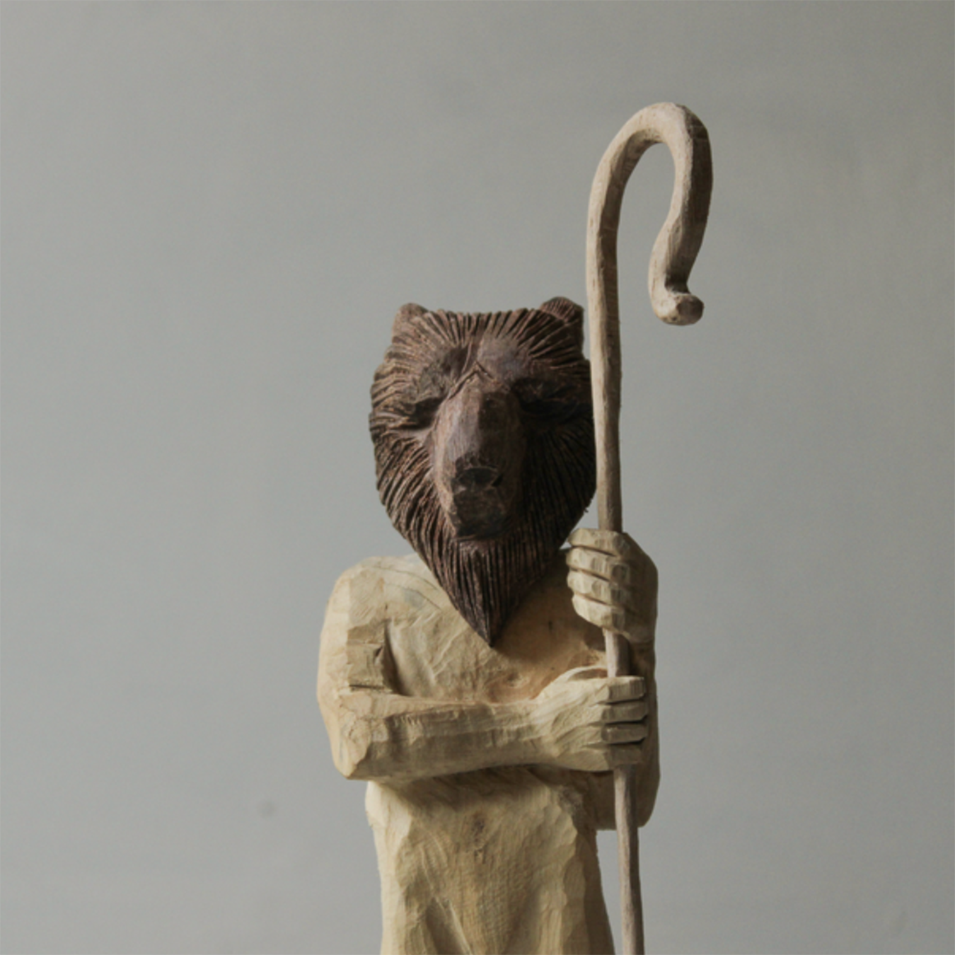 Carved wooden figure carving with a shepherd’s crook and bear mask. Gibus creates striking works where the lightness of the forms contrasts with the density of the subject. As a philosophical gesture, his art questions human beings about their own existence, letting the material express its truth.