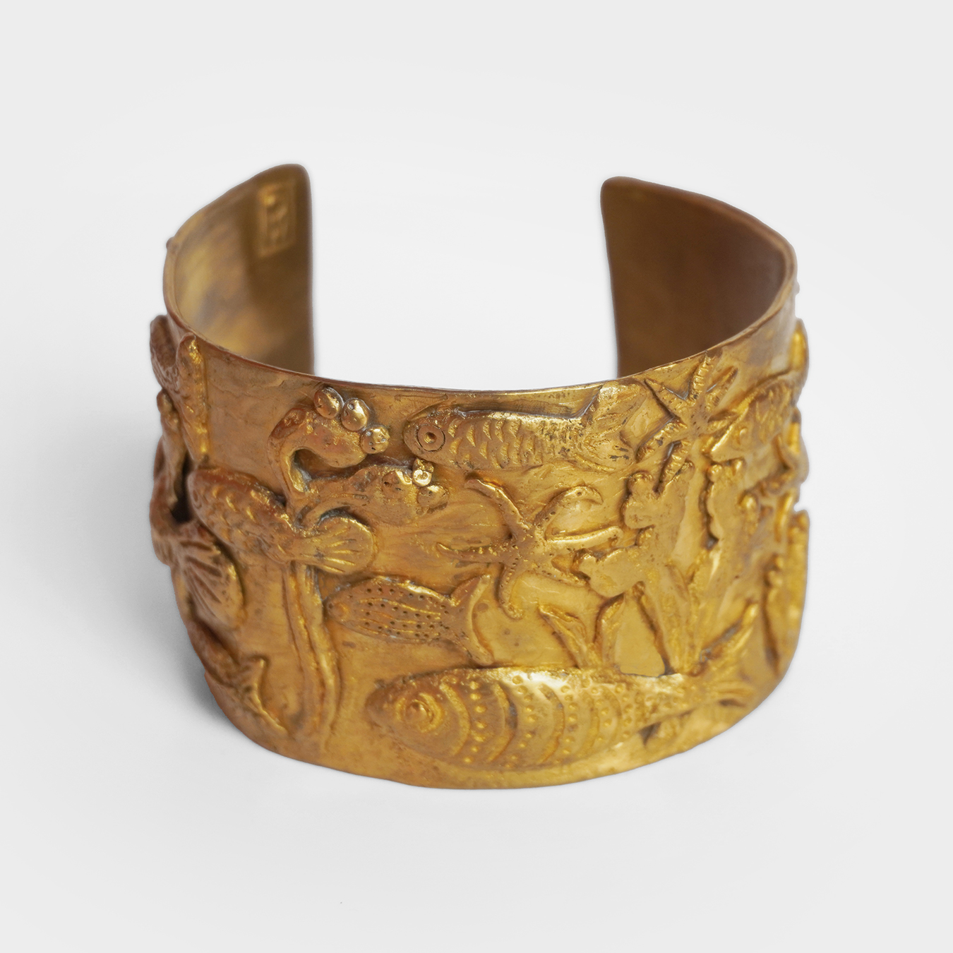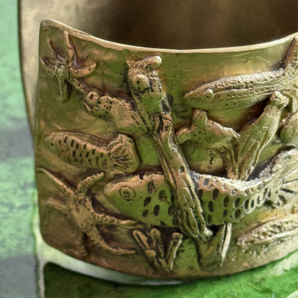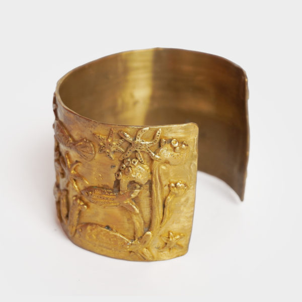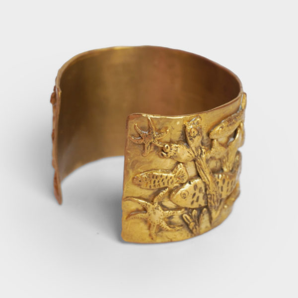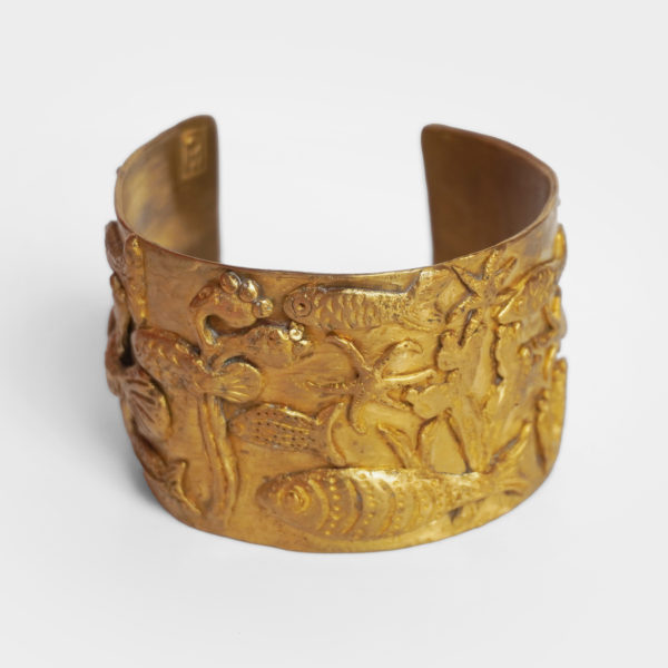 Inspiration: Michelle Crouzet’s unique jewels are sculpted in bronze and are inspired by the shapes and symbols of Antiquity, between mythology, nature and archaeological traces. The rings, cuffs and pendants summon animals, fish, foliage and engraved figures, like so many timeless talismans. The material work, deliberately raw and patina, echoes buried treasures and votive adornments, transforming each piece into an object of memory and identity.