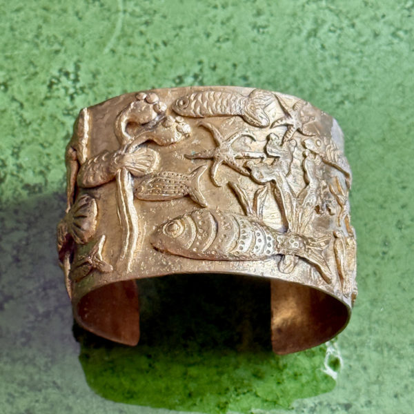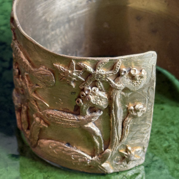 Michelle Crouzet’s bronze bracelets, cuffs and pendants summon animals, fish, foliage and engraved figures, like so many timeless talismans.
