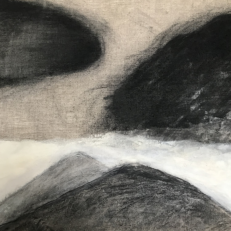 Painting Montagnes, Nuages, on Horizon Blanc in charcoal, acrylic and white clay made by Beatrice Pontacq on a canvas of raw linen. The artist is inspired by recognizable natural elements to create abstract paintings.