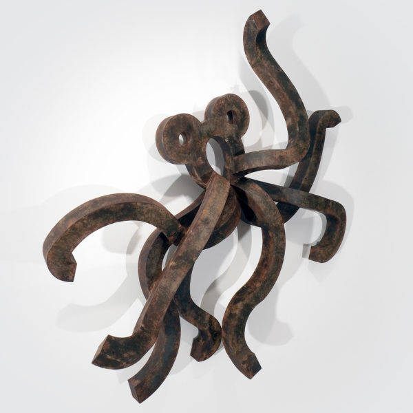 Wall sculpture in hand-patinated zinc sheet, An artist’s purity reminiscent of the features of an octopus with large eyes. Unique piece.