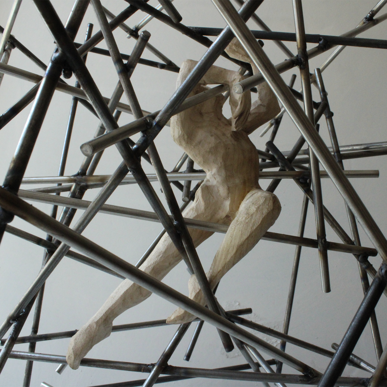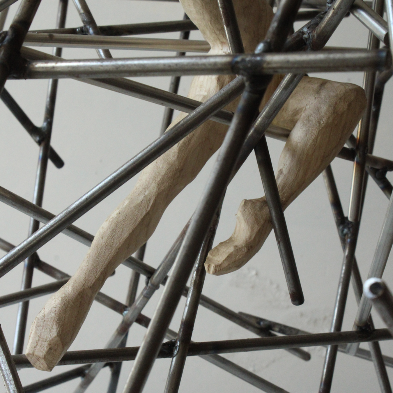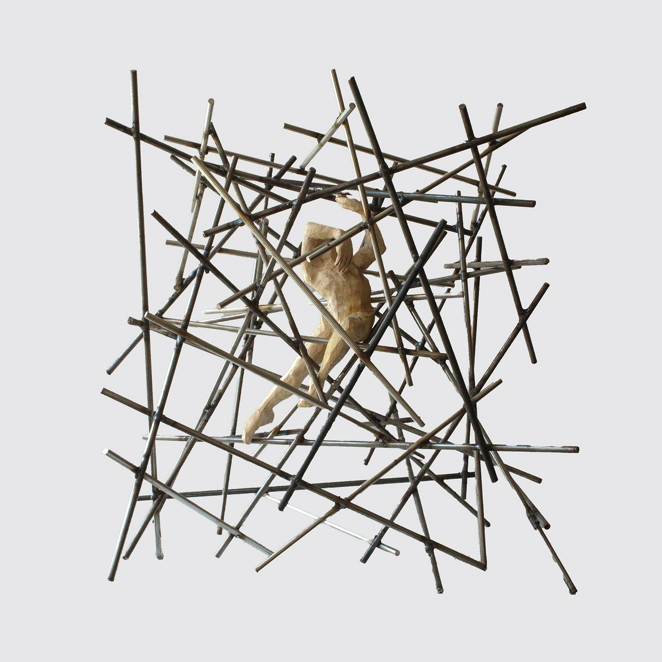 Sculpture of a carved wooden figure caught in an inextricable metal frame. Gibus creates striking works where the lightness of the forms contrasts with the density of the subject. As a philosophical gesture, his art questions human beings about their own existence, letting the material express its truth.
