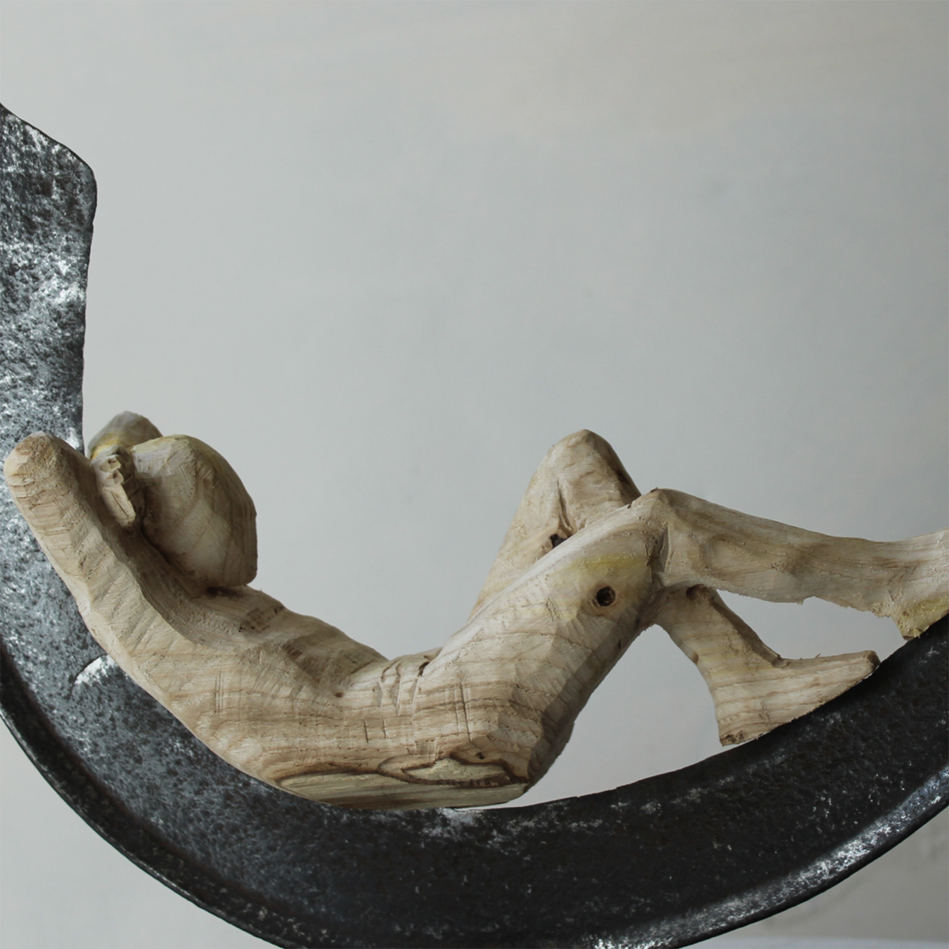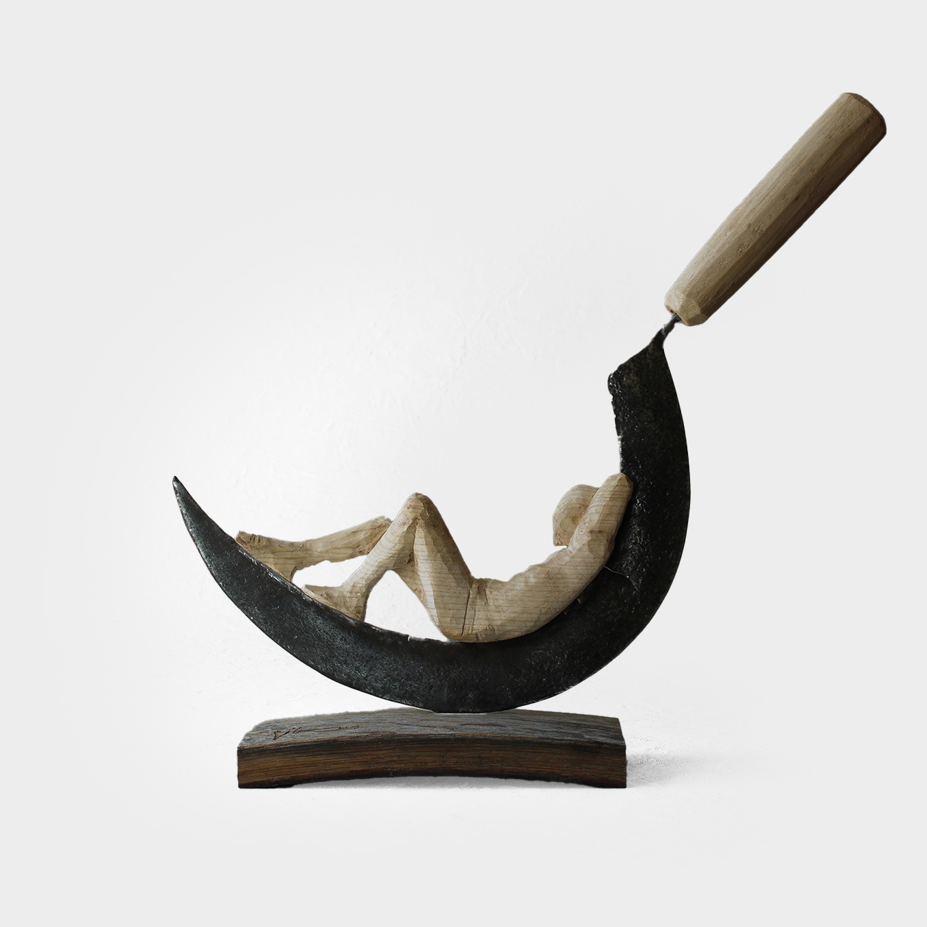 Sculpture of a figure lying on a sickle. Gibus creates striking works where the lightness of the forms contrasts with the density of the subject. As a philosophical gesture, his art questions human beings about their own existence, letting the material express its truth.