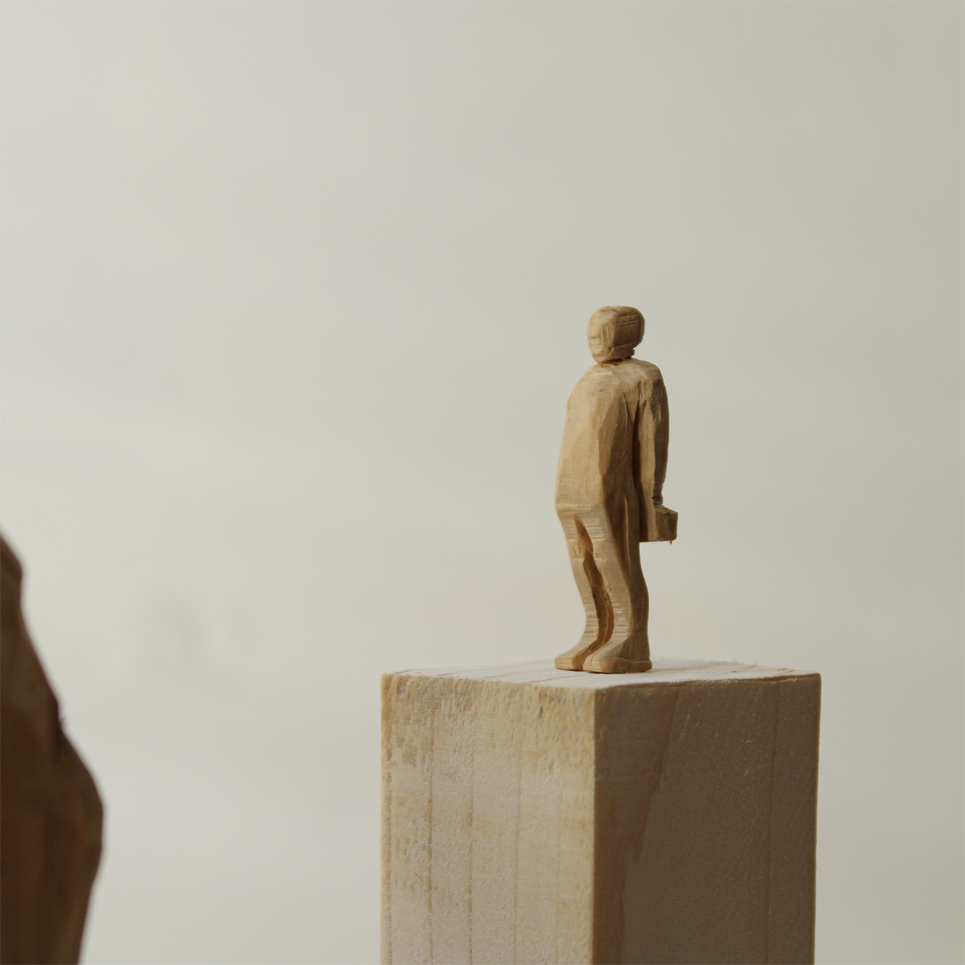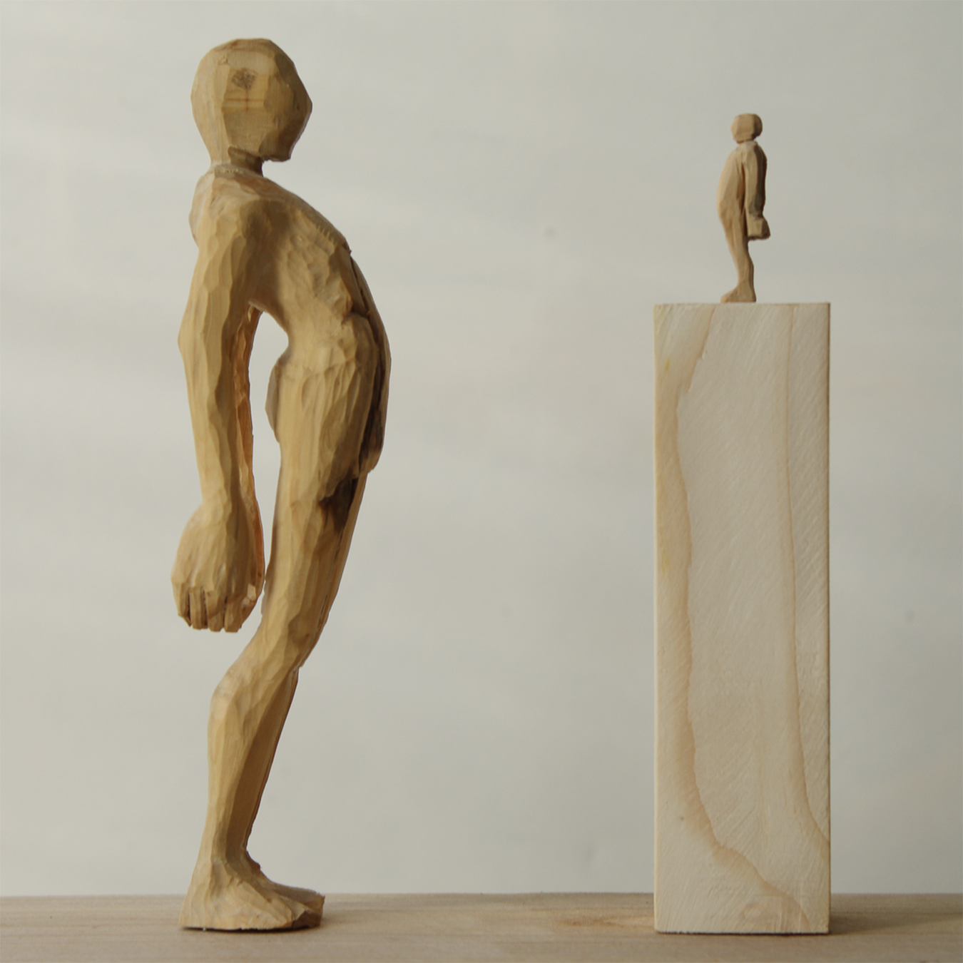 Sculpture of a carved wooden figure facing his miniature double. Gibus creates striking works where the lightness of the forms contrasts with the density of the subject. As a philosophical gesture, his art questions human beings about their own existence, letting the material express its truth.