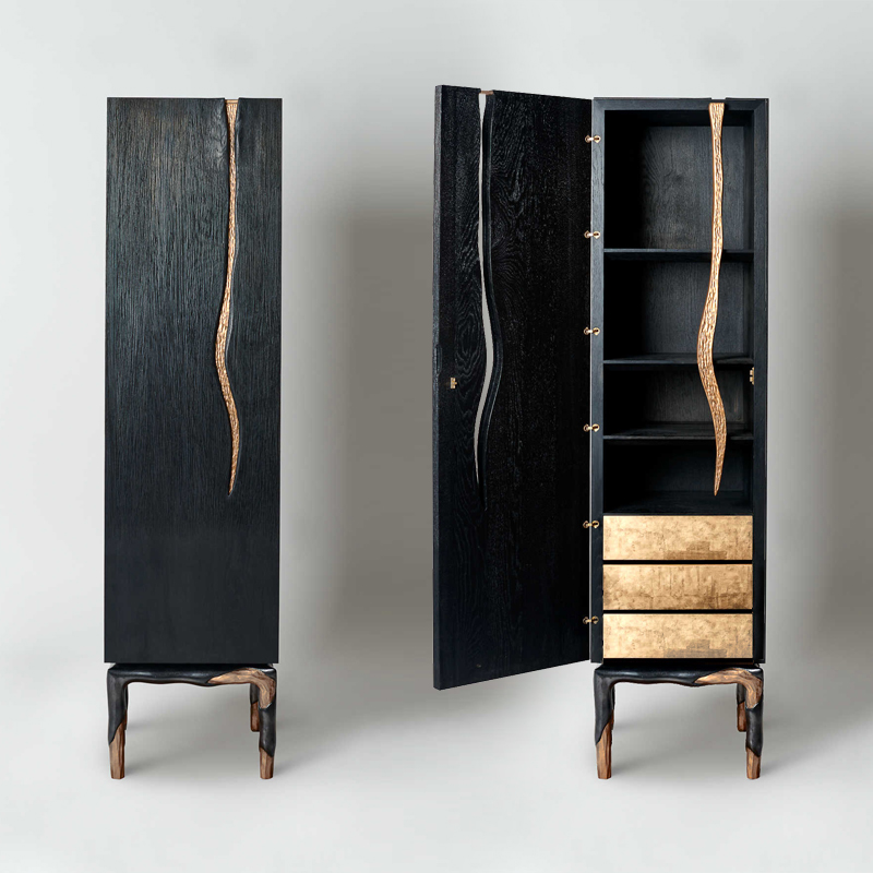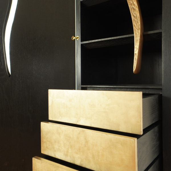 Storage column in oak and bronze, dyed with Indian ink and carved with gouge, with 3 drawers covered with gold leaf. Hoon Moreau is inspired by the beauty of the elements that touch it, such as the splendors of nature, jewelry or haute couture, to create unique and functional furniture.