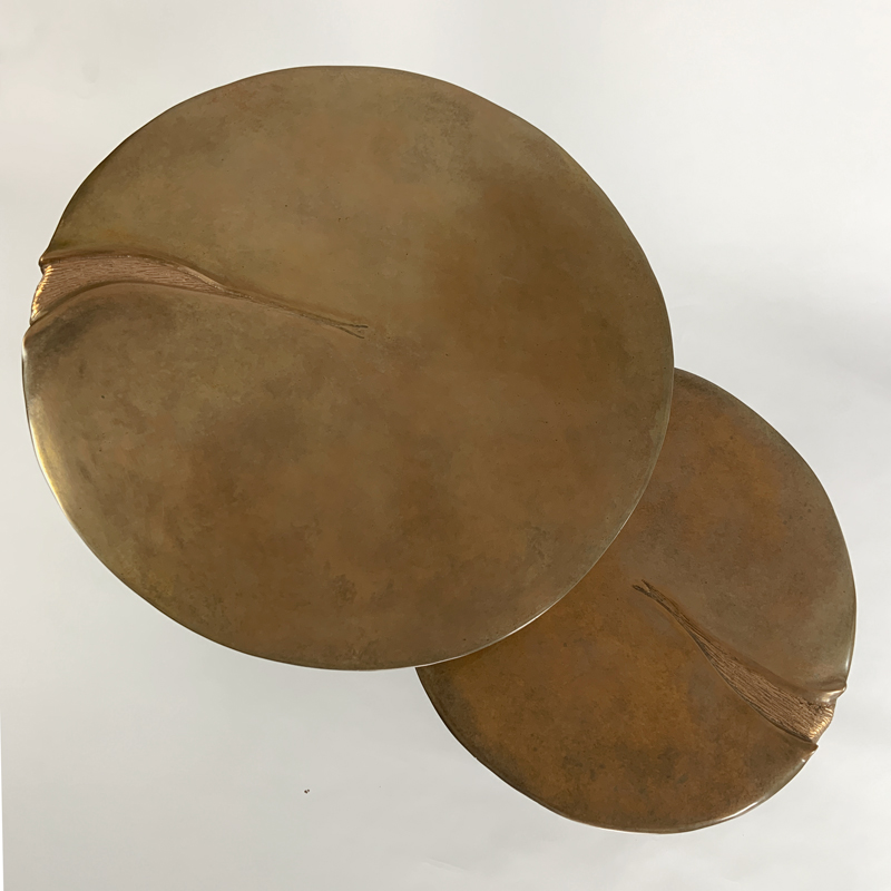 Pair of bronze carved coffee tables signed Hoon Moreau. The artist is inspired by the beauty of the elements that touch her, such as splendours from nature, jewelry or haute couture, to create functional sculptures.