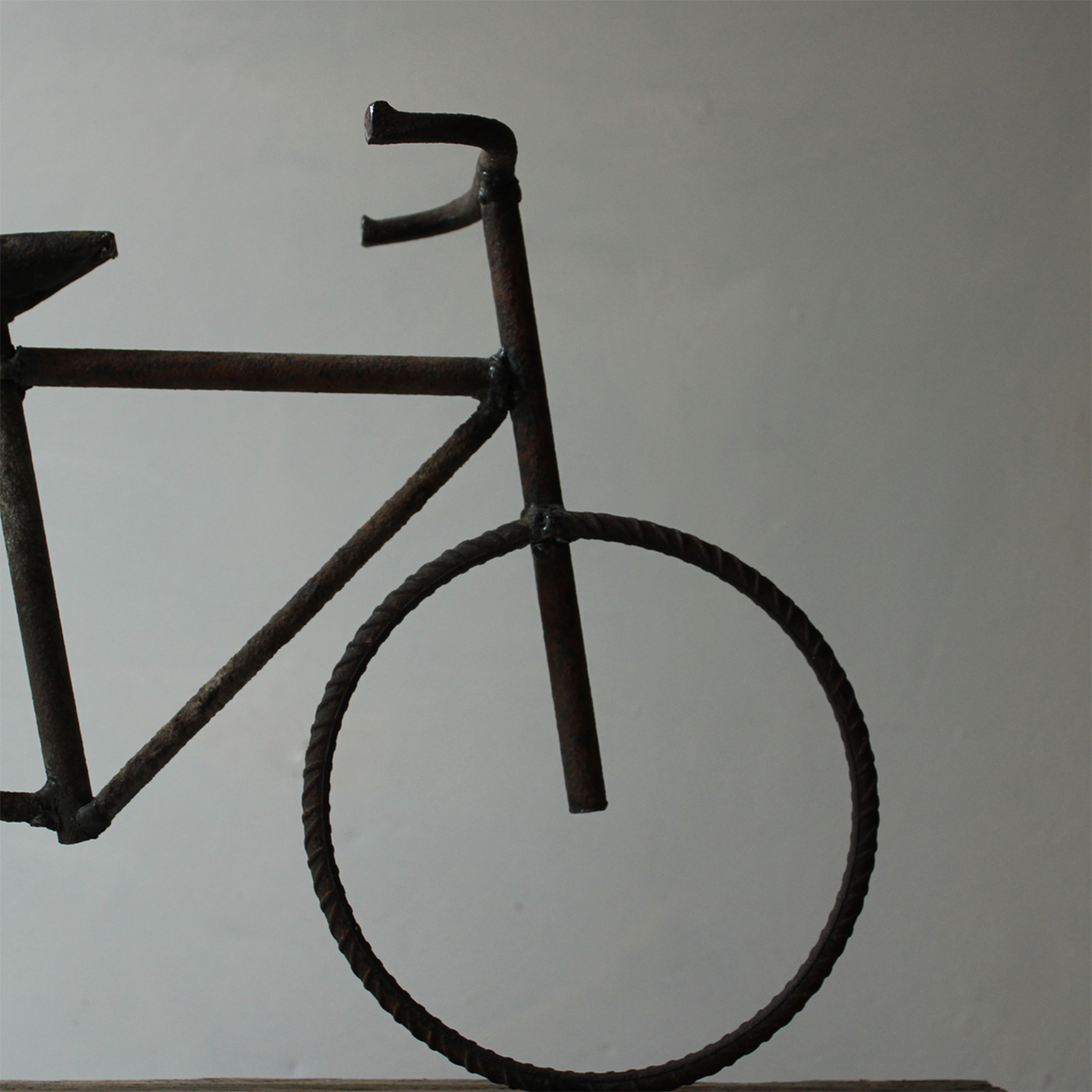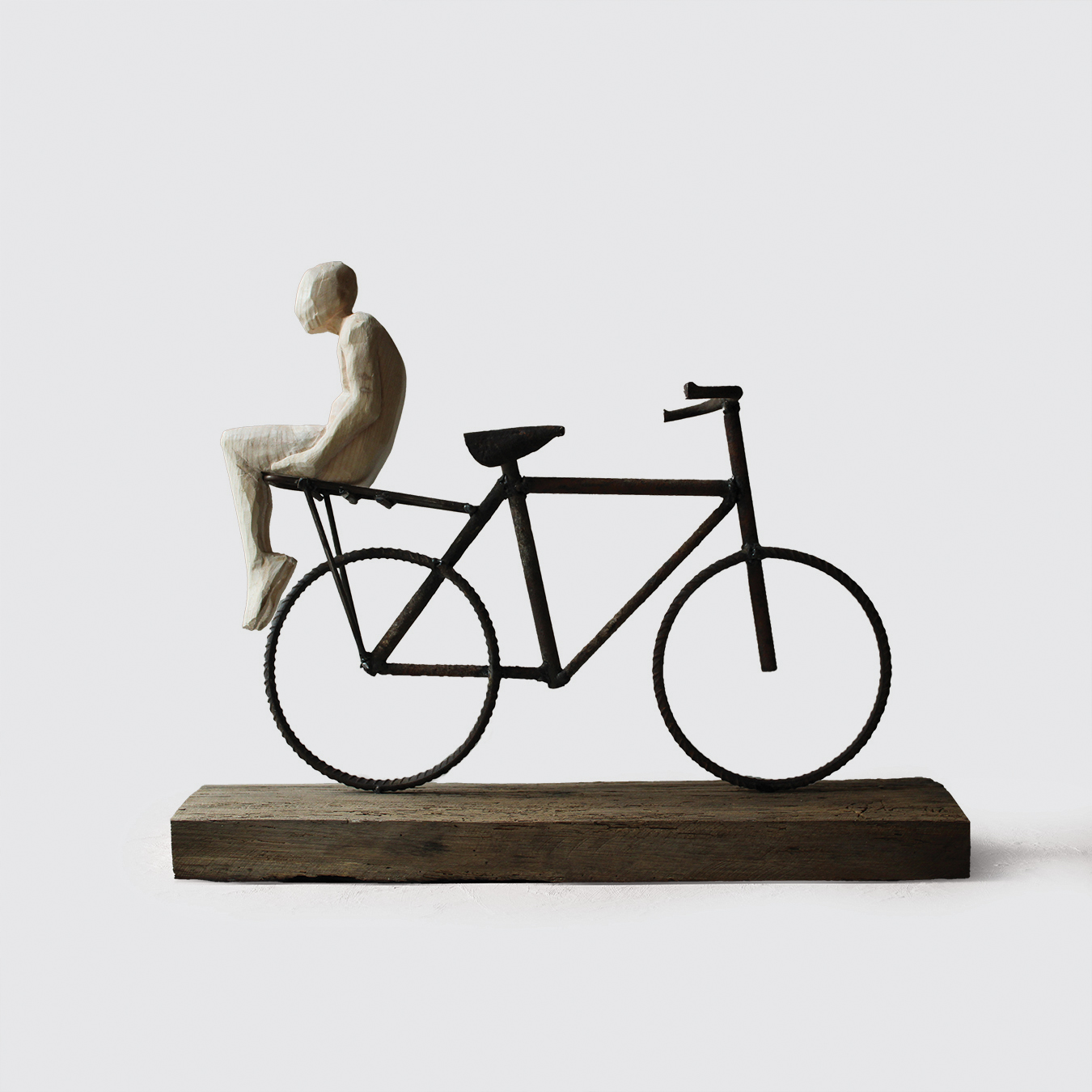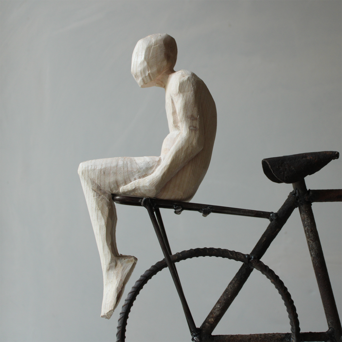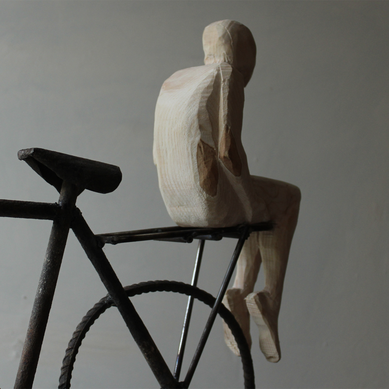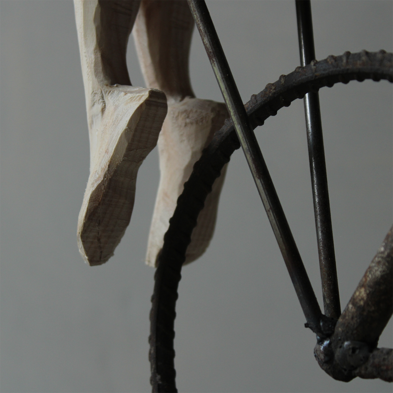 Sculpture of a wooden figure sitting upside down on a bicycle. Gibus creates striking works where the lightness of the forms contrasts with the density of the subject. As a philosophical gesture, his art questions human beings about their own existence, letting the material express its truth.
