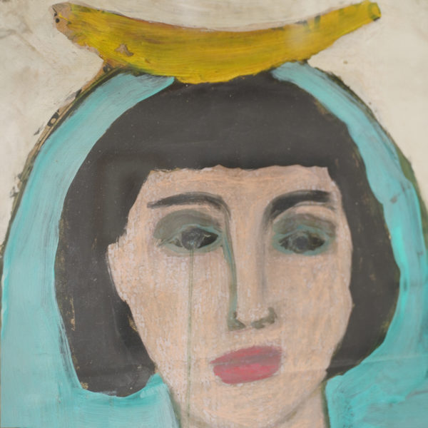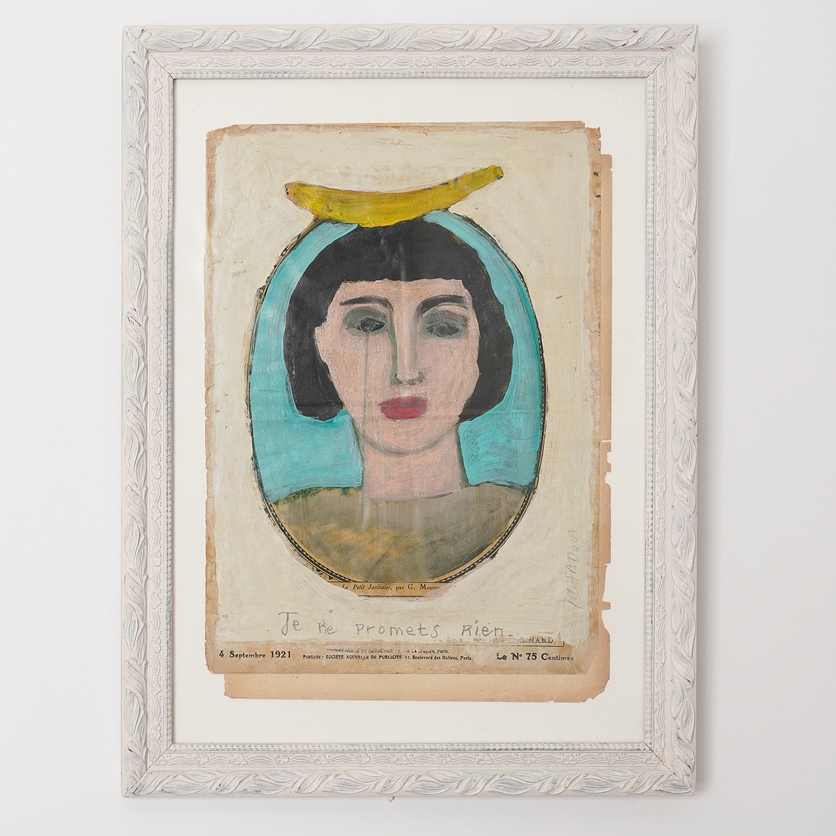Drawing of a portrait of a woman topped with a banana on old paper, by Corinne Tichadou. Antique bleached wooden frame under protective glass.