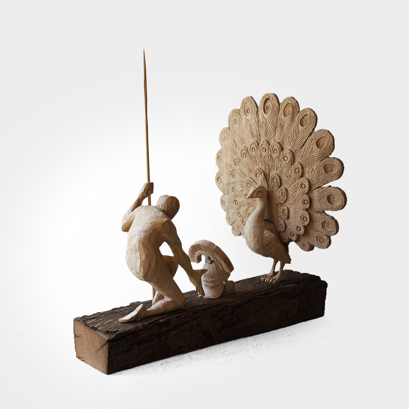 Sculpture of a soldier kneeling in front of a peacock. Gibus creates striking works where the lightness of the forms contrasts with the density of the subject. As a philosophical gesture, his art questions human beings about their own existence, letting the material express its truth.