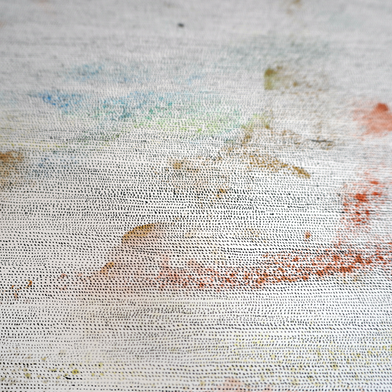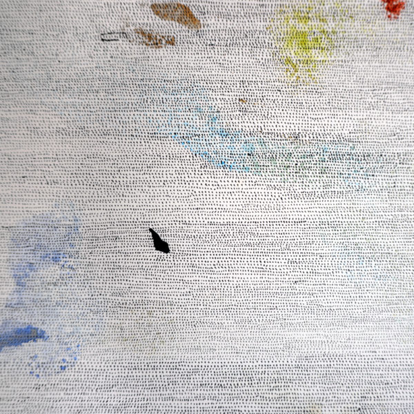 His abstract drawings evoke infinitely small universes like so many imaginary cartographies. It plunges us into celestial or underwater worlds, leading us into a sensory contemplation provoked by its plastic vocabulary made up of points, lines and circles.