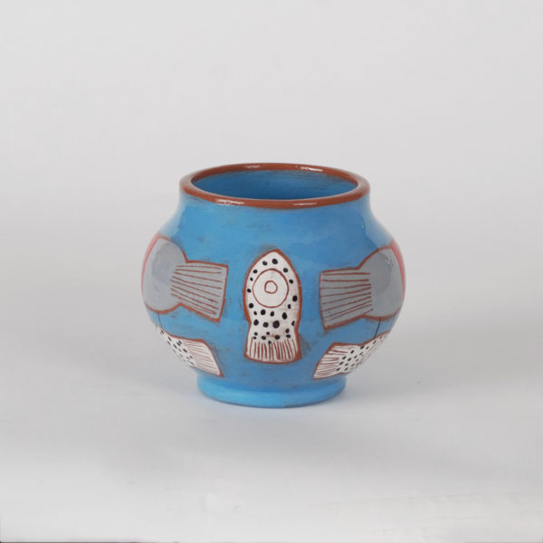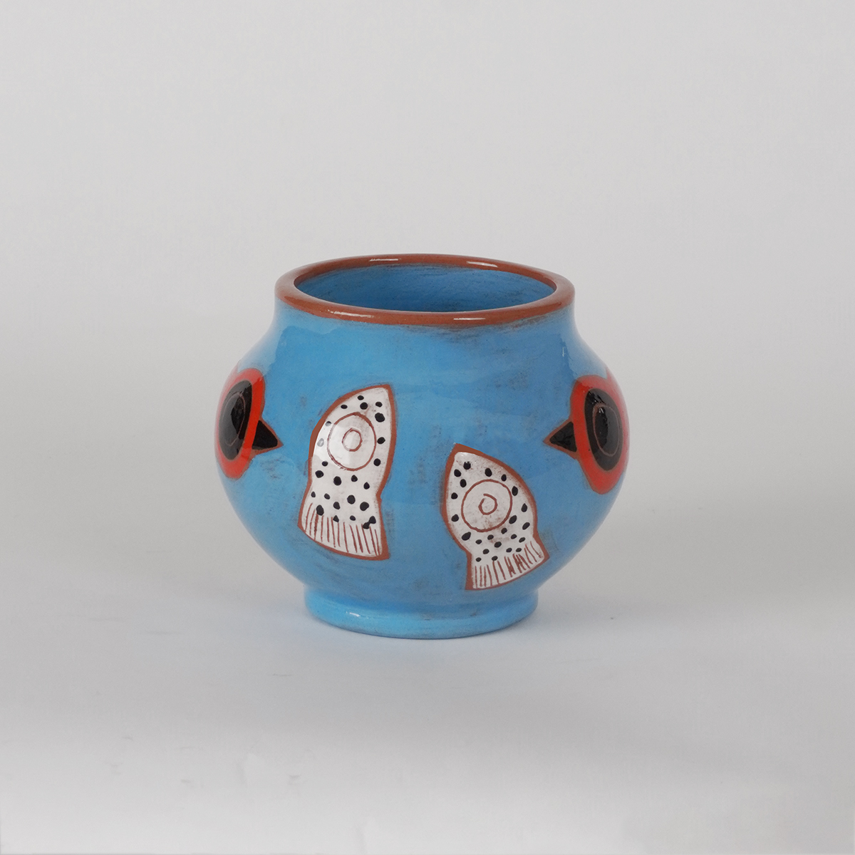 Blue ball vase in red ceramic by Béatriz Garrigo, glazed and decorated with fish and birds. Unique piece, signed.
