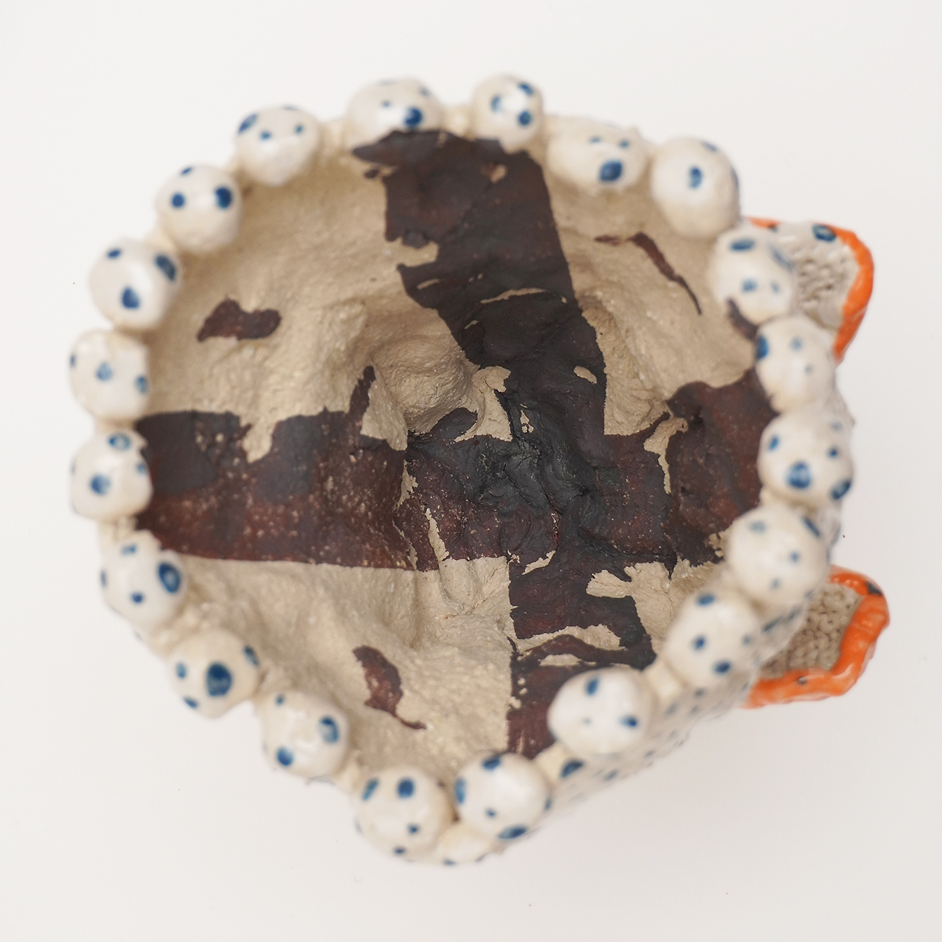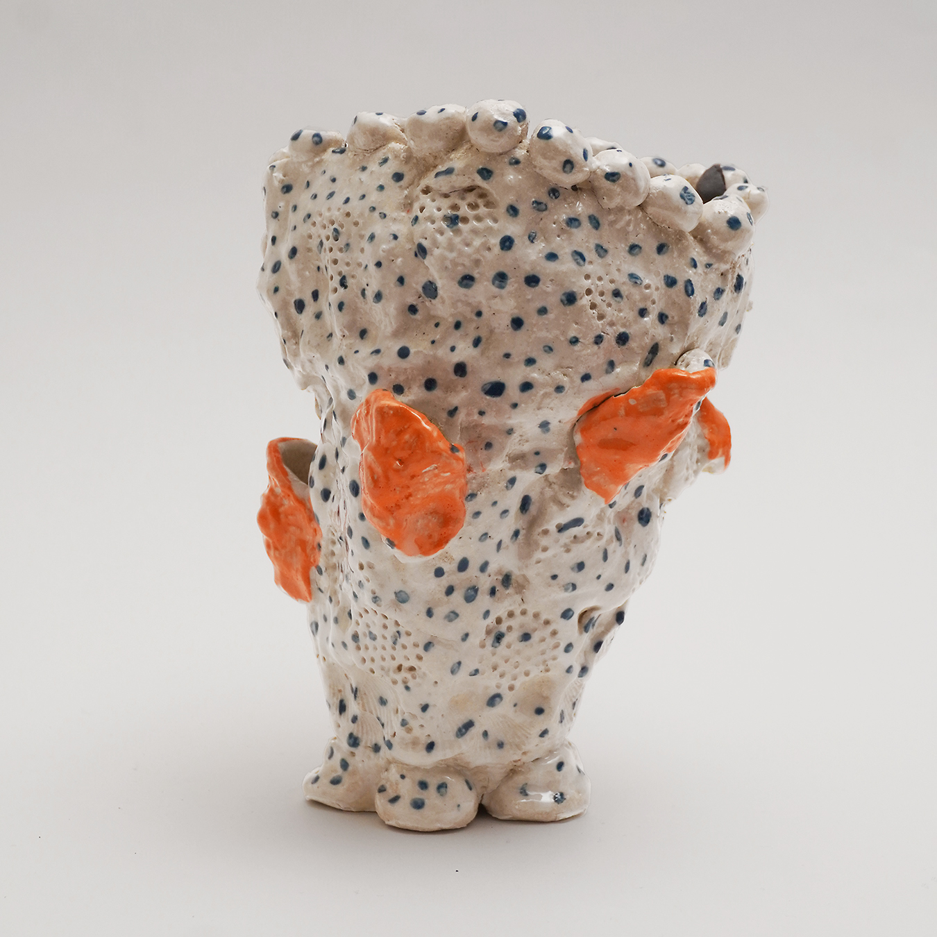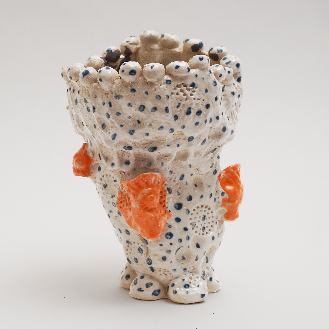 Inspiration:“When I work with clay, my starting rule is the container (bowl, vase, bowl, etc.). Often mounted with a coil, sometimes by extraction, the piece is initially built in the image of a simple form. The rest is more instinctive, the earth dictates the sequence to me; the coil becomes unfinished, creating appendages to the original container; Peaks, openings, volutes arrive as the last gestures of modelling. On the still malleable sandstone I place a decoration of oxide or engobes, dots and lines of colors that drip on themselves, or small dots systematically applied with a brush or engraved in the earth. After the first firing, I often draw with oxide pencil on the piece. Before the final firing, partial or total glazing completes the piece, between shadow and light. The original rule is respected, the container has lost its usefulness, it has become a sculpture object. My desire is not to look for a boundary between container and sculpture, only to find a balance between function and its possible abstraction.”