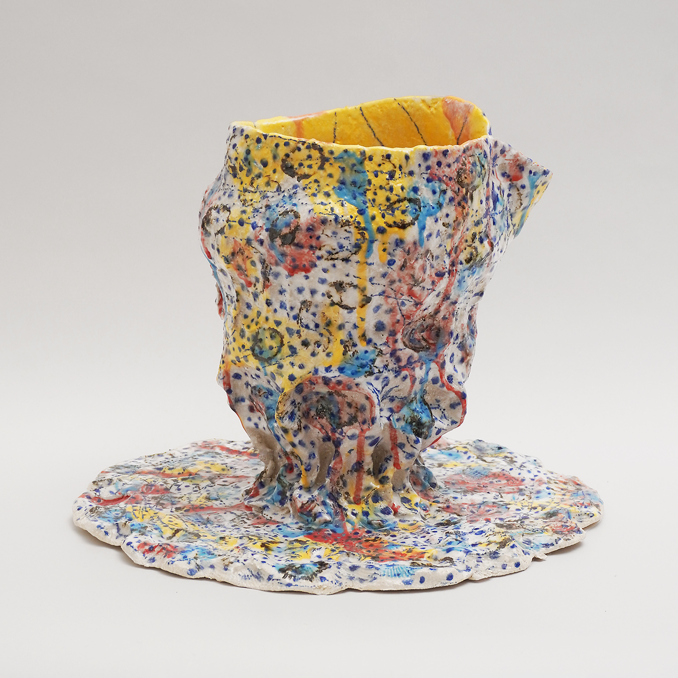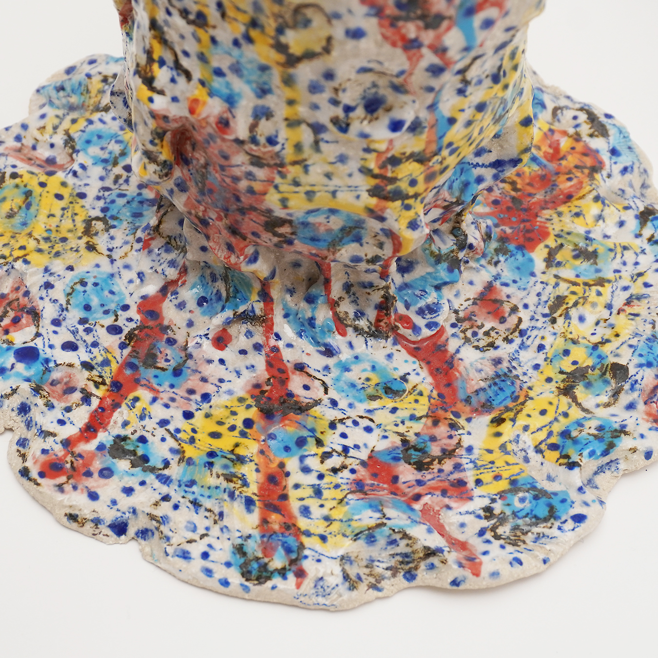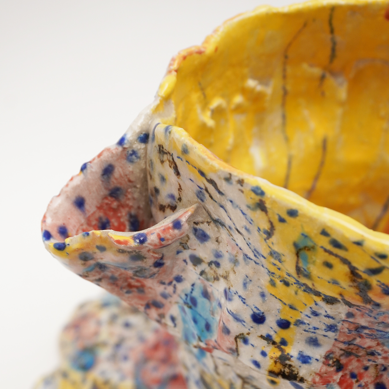 Inspiration:“When I work with clay, my starting rule is the container (bowl, vase, bowl, etc.). Often mounted with a coil, sometimes by extraction, the piece is initially built in the image of a simple form. The rest is more instinctive, the earth dictates the sequence to me; the coil becomes unfinished, creating appendages to the original container; Peaks, openings, volutes arrive as the last gestures of modelling. On the still malleable sandstone I place a decoration of oxide or engobes, dots and lines of colors that drip on themselves, or small dots systematically applied with a brush or engraved in the earth. After the first firing, I often draw with oxide pencil on the piece. Before the final firing, partial or total glazing completes the piece, between shadow and light. The original rule is respected, the container has lost its usefulness, it has become a sculpture object. My desire is not to look for a boundary between container and sculpture, only to find a balance between function and its possible abstraction.”
