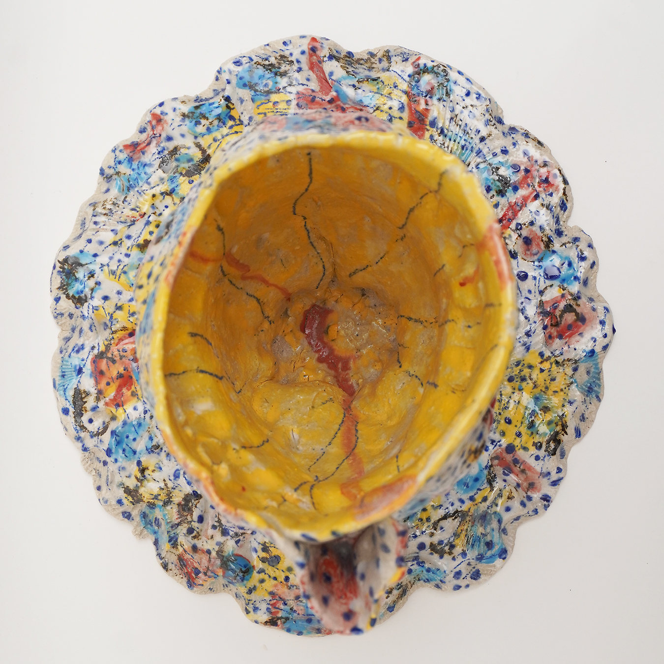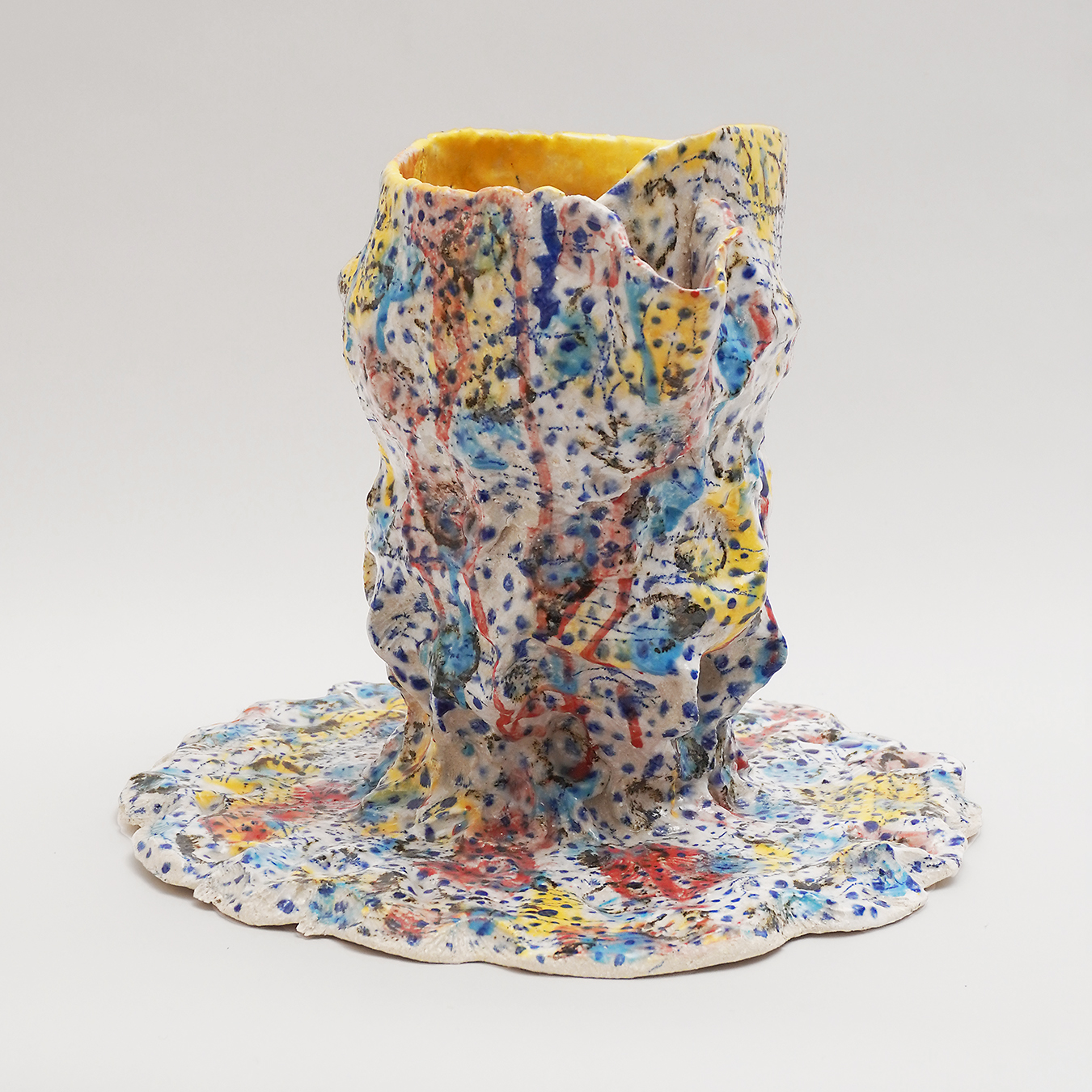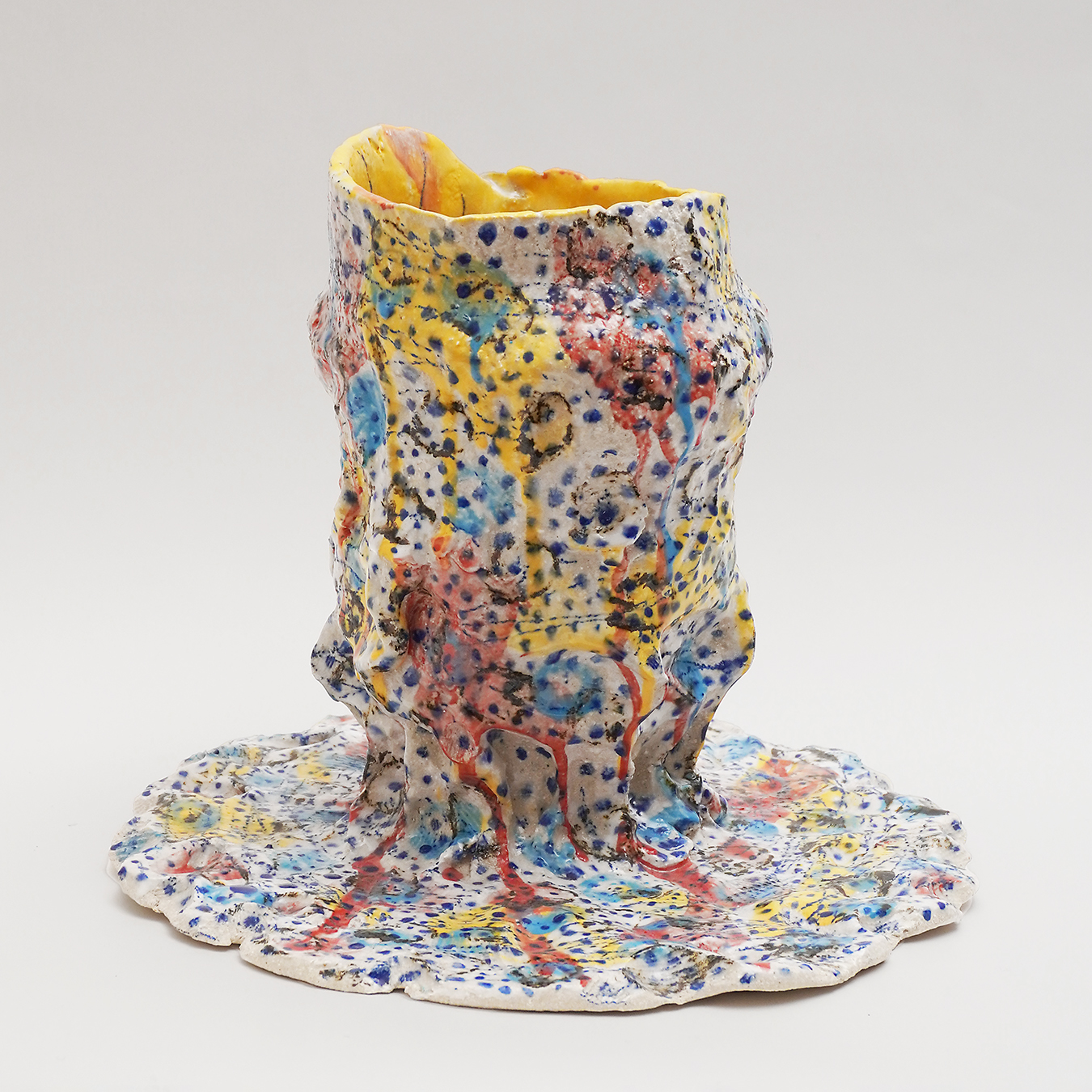 Inspiration:“When I work with clay, my starting rule is the container (bowl, vase, bowl, etc.). Often mounted with a coil, sometimes by extraction, the piece is initially built in the image of a simple form. The rest is more instinctive, the earth dictates the sequence to me; the coil becomes unfinished, creating appendages to the original container; Peaks, openings, volutes arrive as the last gestures of modelling. On the still malleable sandstone I place a decoration of oxide or engobes, dots and lines of colors that drip on themselves, or small dots systematically applied with a brush or engraved in the earth. After the first firing, I often draw with oxide pencil on the piece. Before the final firing, partial or total glazing completes the piece, between shadow and light. The original rule is respected, the container has lost its usefulness, it has become a sculpture object. My desire is not to look for a boundary between container and sculpture, only to find a balance between function and its possible abstraction.”
