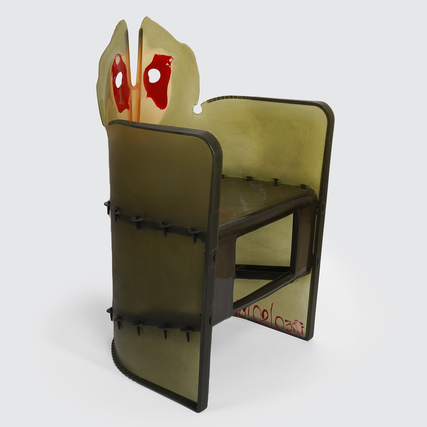 État : La résine du dossier a été restaurée en 2023 (réparation muséale, pas illusioniste). Les fissures liées à l’histoire de la pièce restent légèrement visibles mais l’état de surface est intact et les dossiers ont retrouvé leur intégrité.