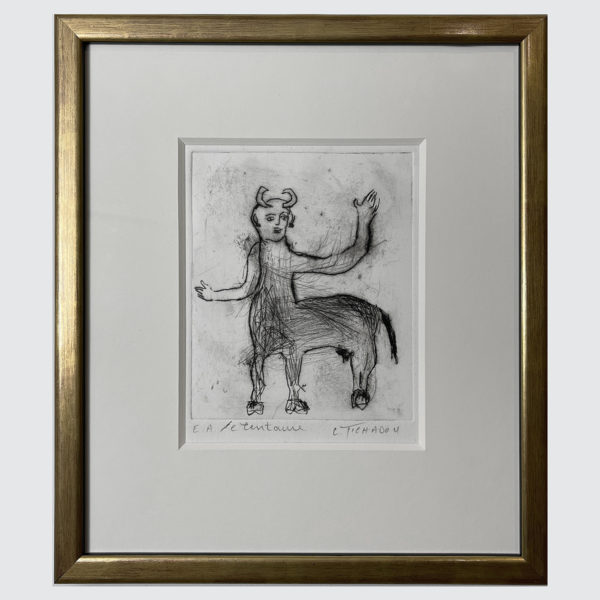 Gravure sur papier d’un centaure. A travers la mythologie, les contes, le théâtre, l’opéra, les récits bibliques et son amour pour la peinture de la renaissance italienne, Corinne Tichadou cherche l’intemporalité.