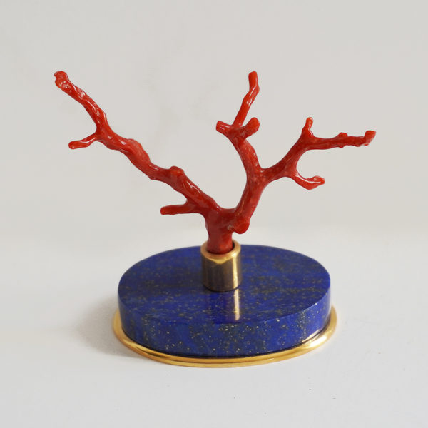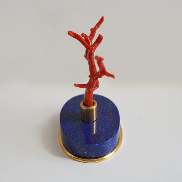 Matériaux : Base ovale en lapis lazuli, monture en laiton plaqué or 24 carats et corail rouge de Méditerranée