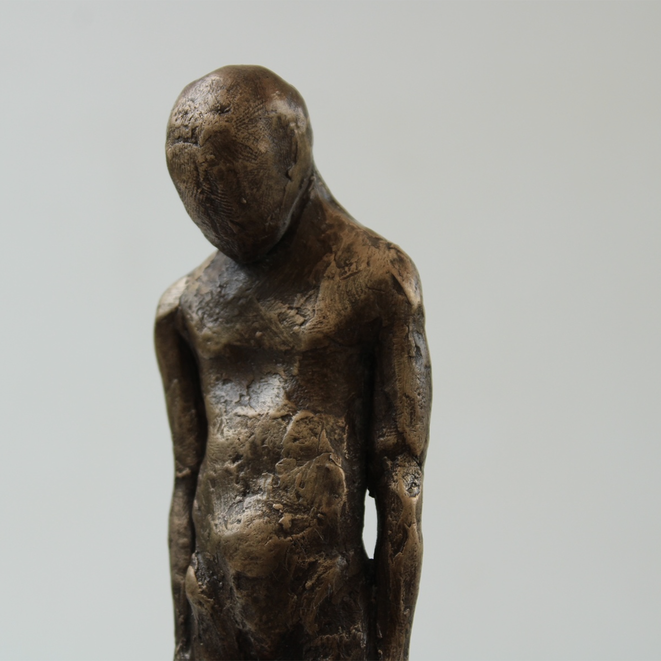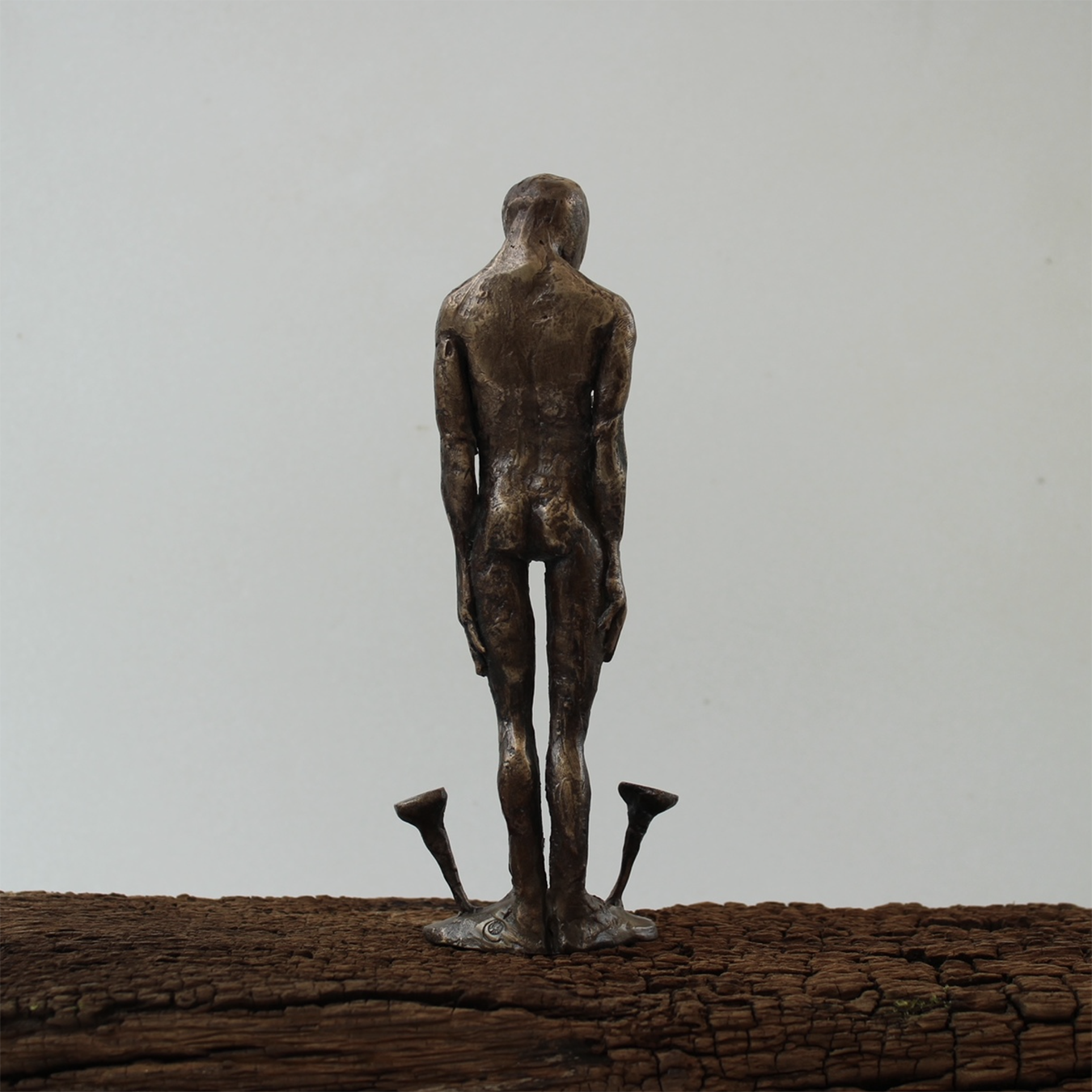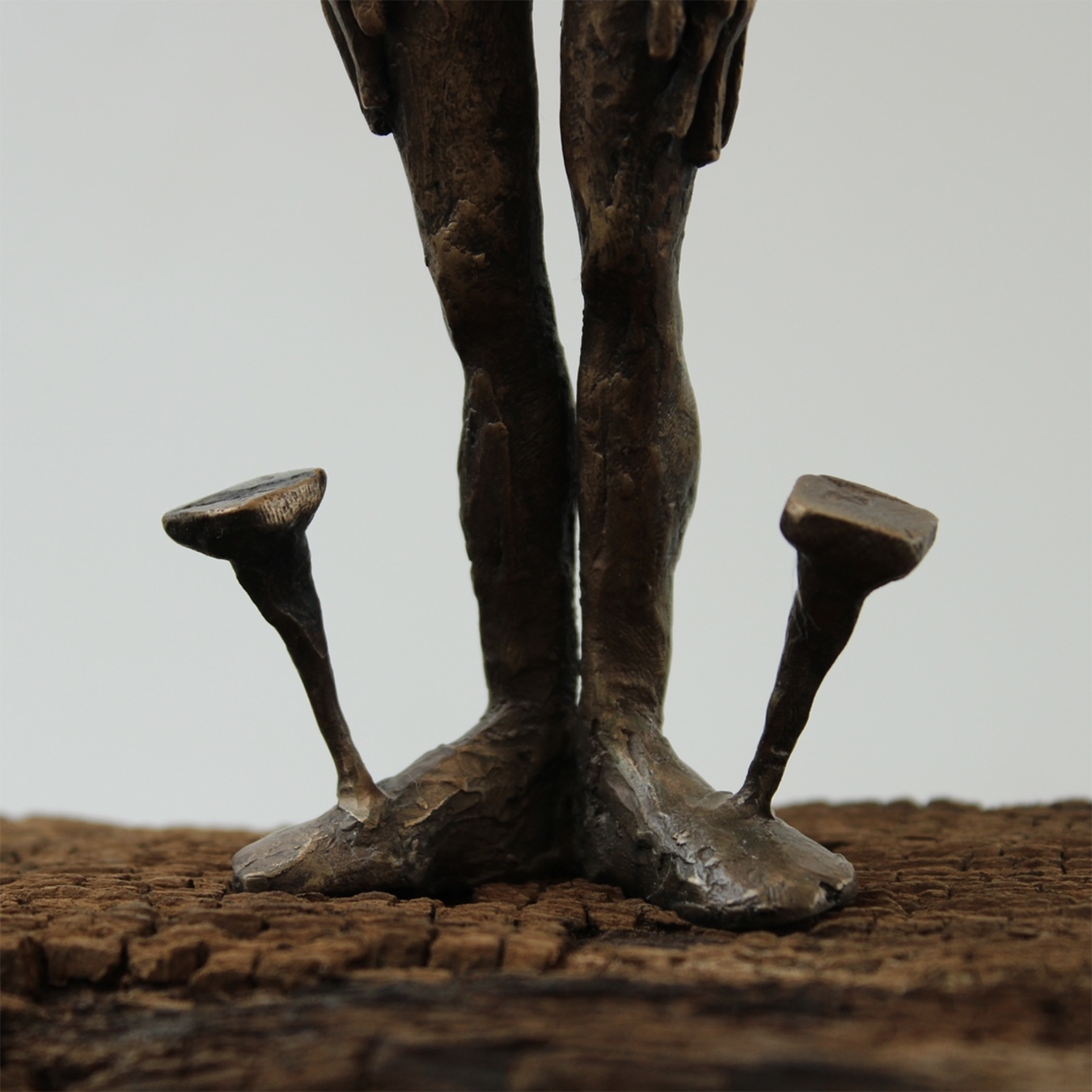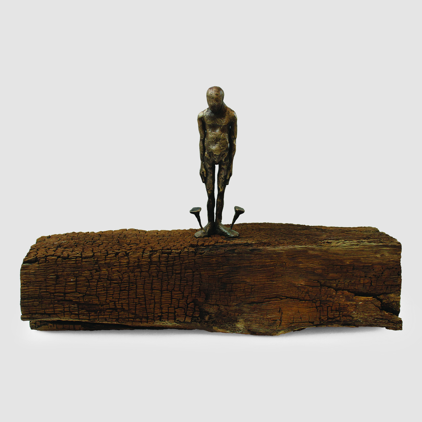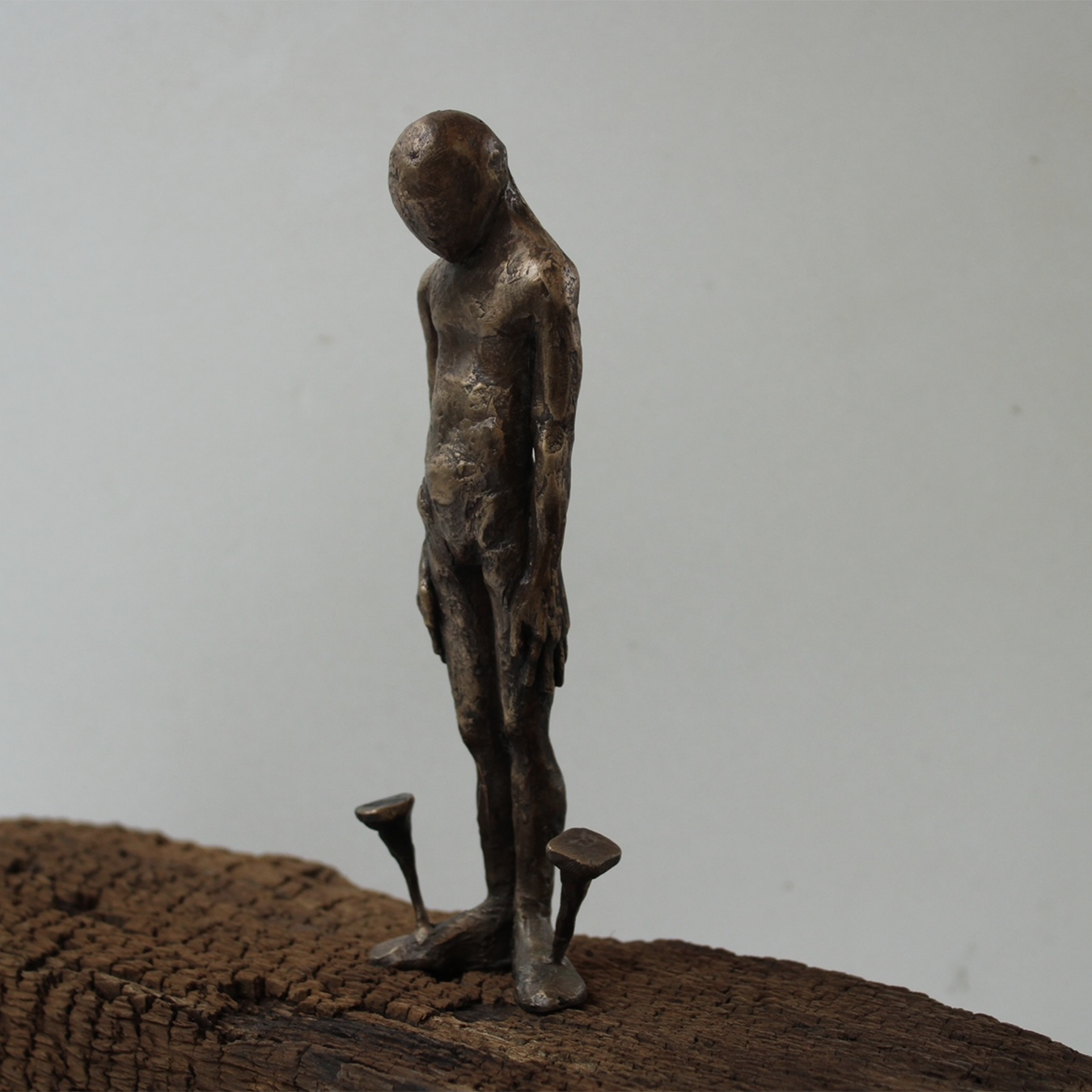Sculpture d’un personnage en bronze cloué au sol. Gibus réalise des œuvres percutantes où la légèreté des formes contraste avec la densité du sujet. Tel un geste philosophique, son art interroge l’être humain sur sa propre existence, laissant la matière exprimer sa vérité.