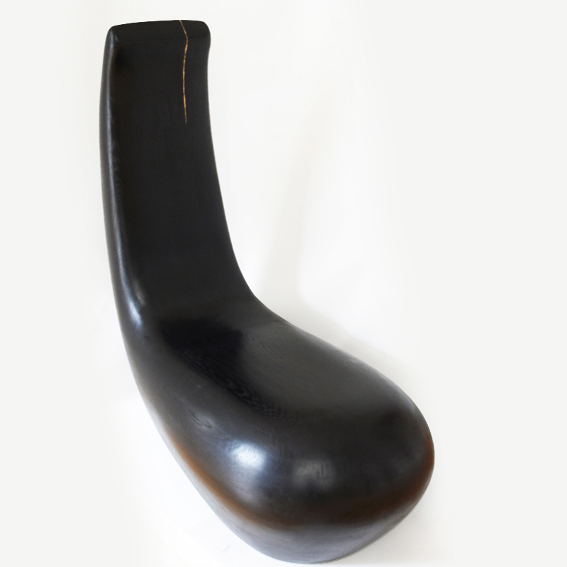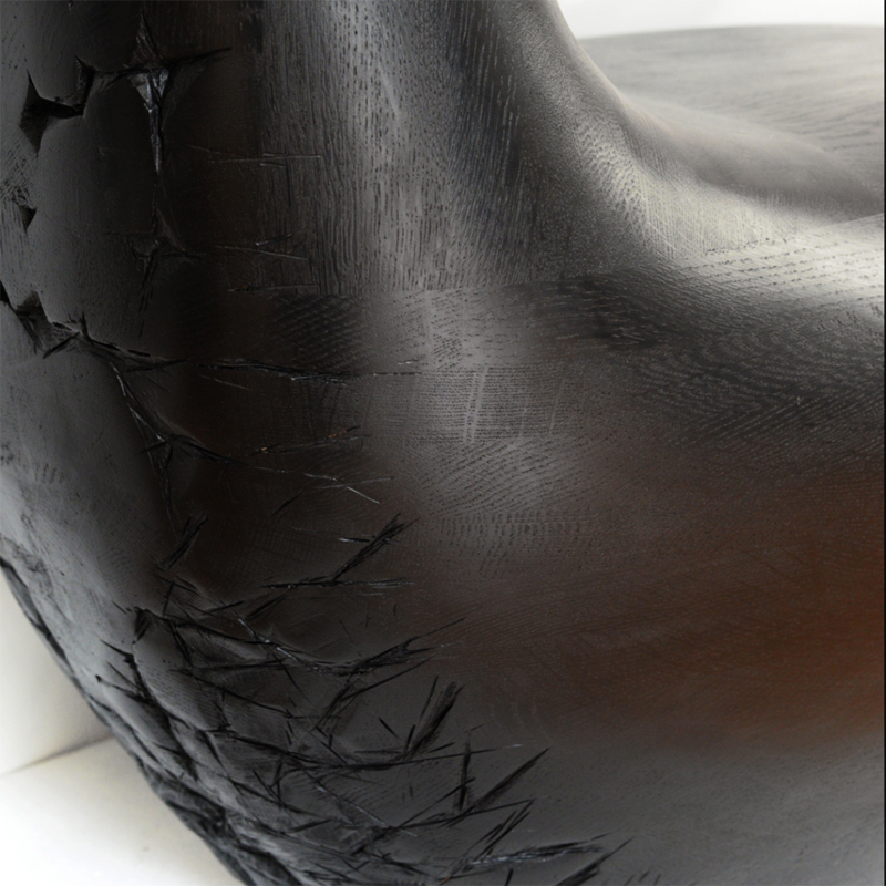 Fauteuil sculpture en chêne massif teinté à l’encre de Chine et sculpté à la gouge. Hoon Moreau s’inspire de la beauté des éléments qui la touchent, telles les splendeurs issues de la nature, la joaillerie ou la haute couture, pour créer du mobilier unique et fonctionnel.