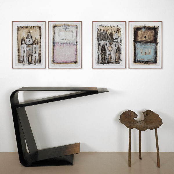 Inspiration : Entamée lors d’un voyage au sud du Portugal en 2022, la série intitulée “Mes Eglises” accompagne l’artiste Sylvie Peyneau dans un tête à tête singulier. La lumière du soleil captée par la chaux blanche des édifices sacrés l’avait alors subjuguée. Masses hypnotiques comme détachées du sol. Ces façades modestes, tour à tour blanches puis enluminées d’or sous les ardents rayons solaires et enfin sépia dans l’embrasement du soir, délivrent leur pouvoir d’apaisement et d’émerveillement.