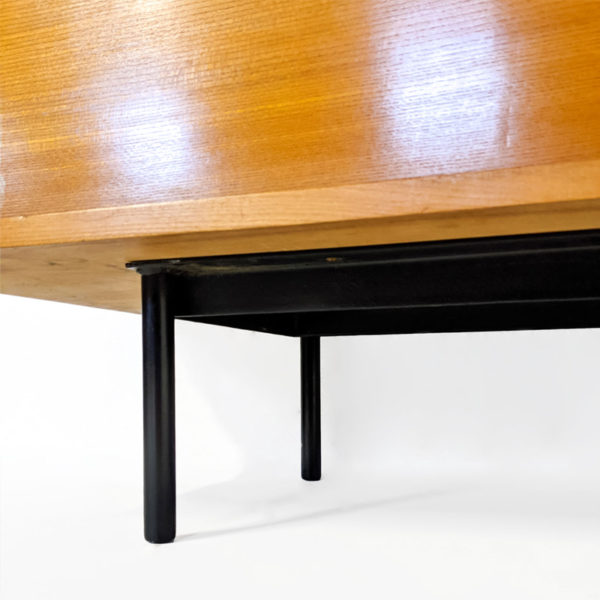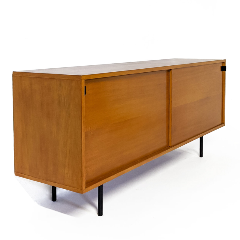 Enfilade en placage d’orme et métal laqué noir réalisée par Alain Richard, éditée en 1950 par la maison Meubles TV. Le modèle 196 se distingue par ses 2 portes coulissantes qui dévoilent un intérieur comprenant 3 tiroirs et 2 étagères, offrant ainsi un bel espace de rangement.