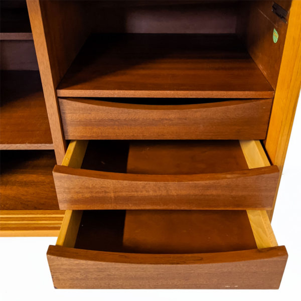 Matériaux : Structure et portes coulissantes en placage d’orme, s’ouvrant en façade sur une série de 3 tiroirs et d’étagères. Piètement en acier laqué noir.