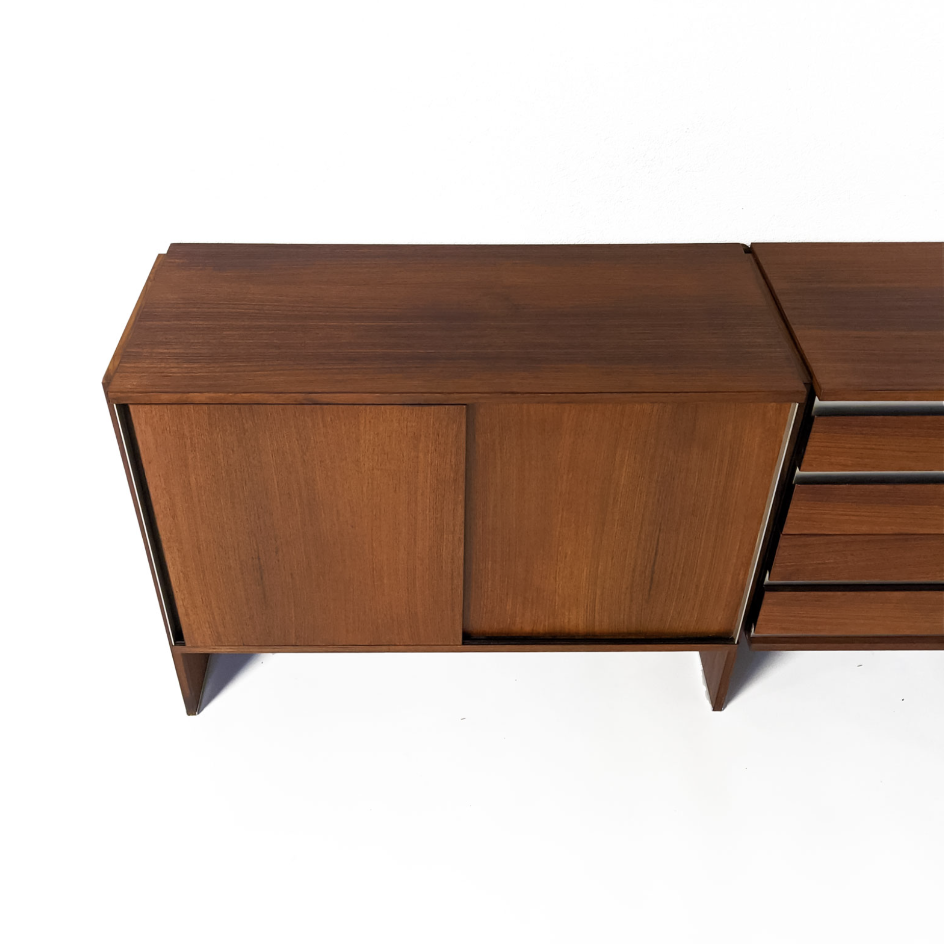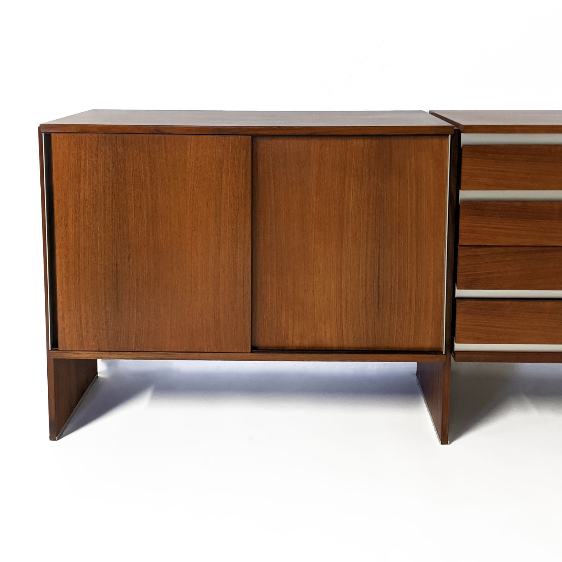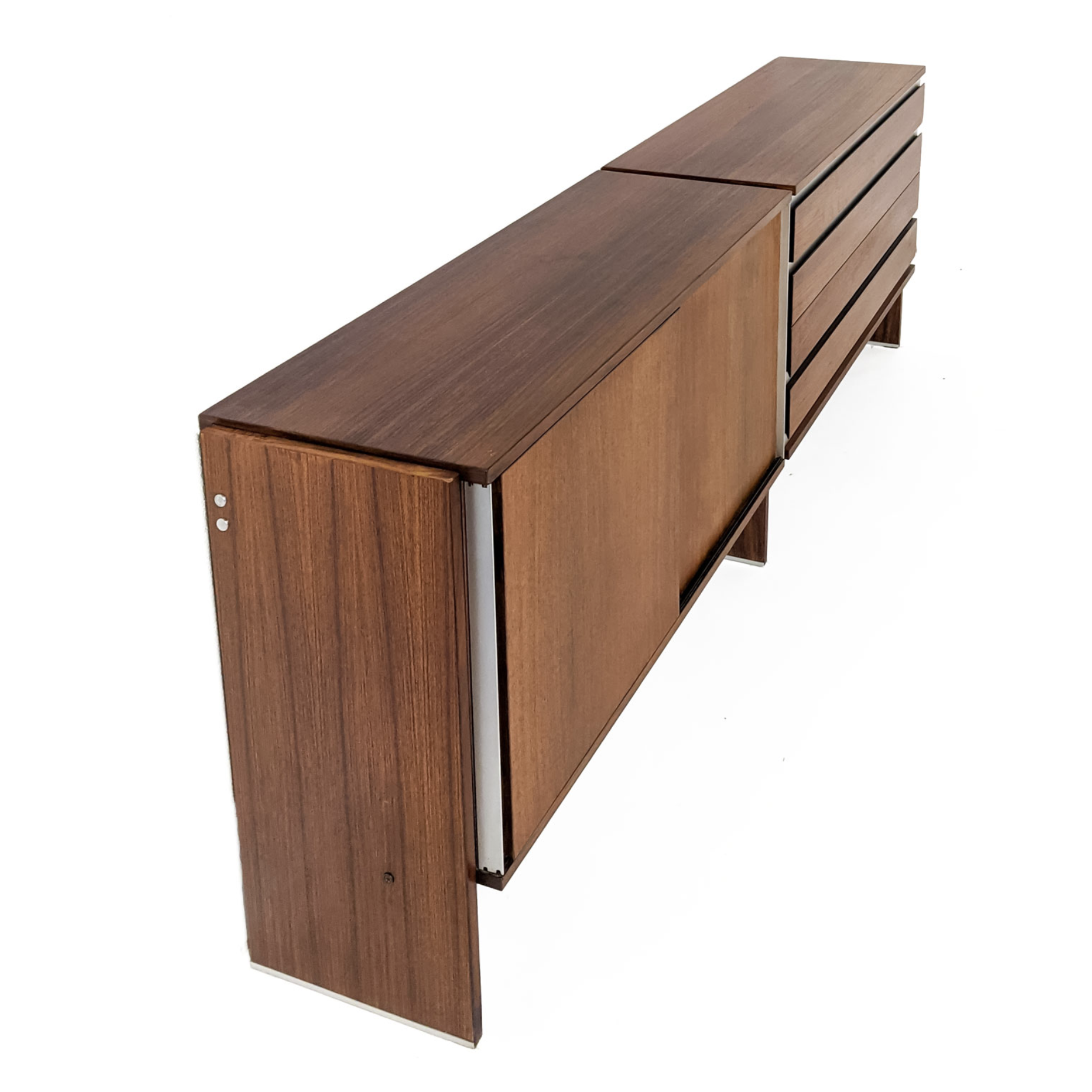 Enfilade vintage italienne réalisée par Ico Parisi pour l’éditeur MIM Roma dans les années 60. Un meuble bas fonctionnel avec des portes coulissantes et quatre tiroirs en façade, dont la finition bi-matière, en placage de palissandre et aluminium, lui donne du caractère et de l’originalité.