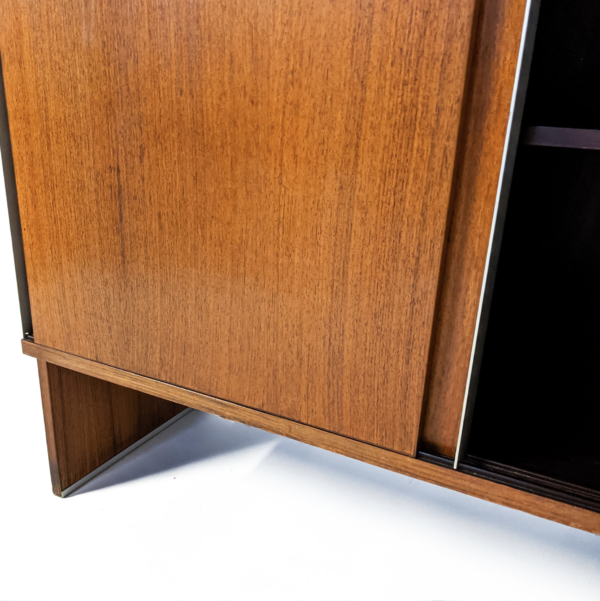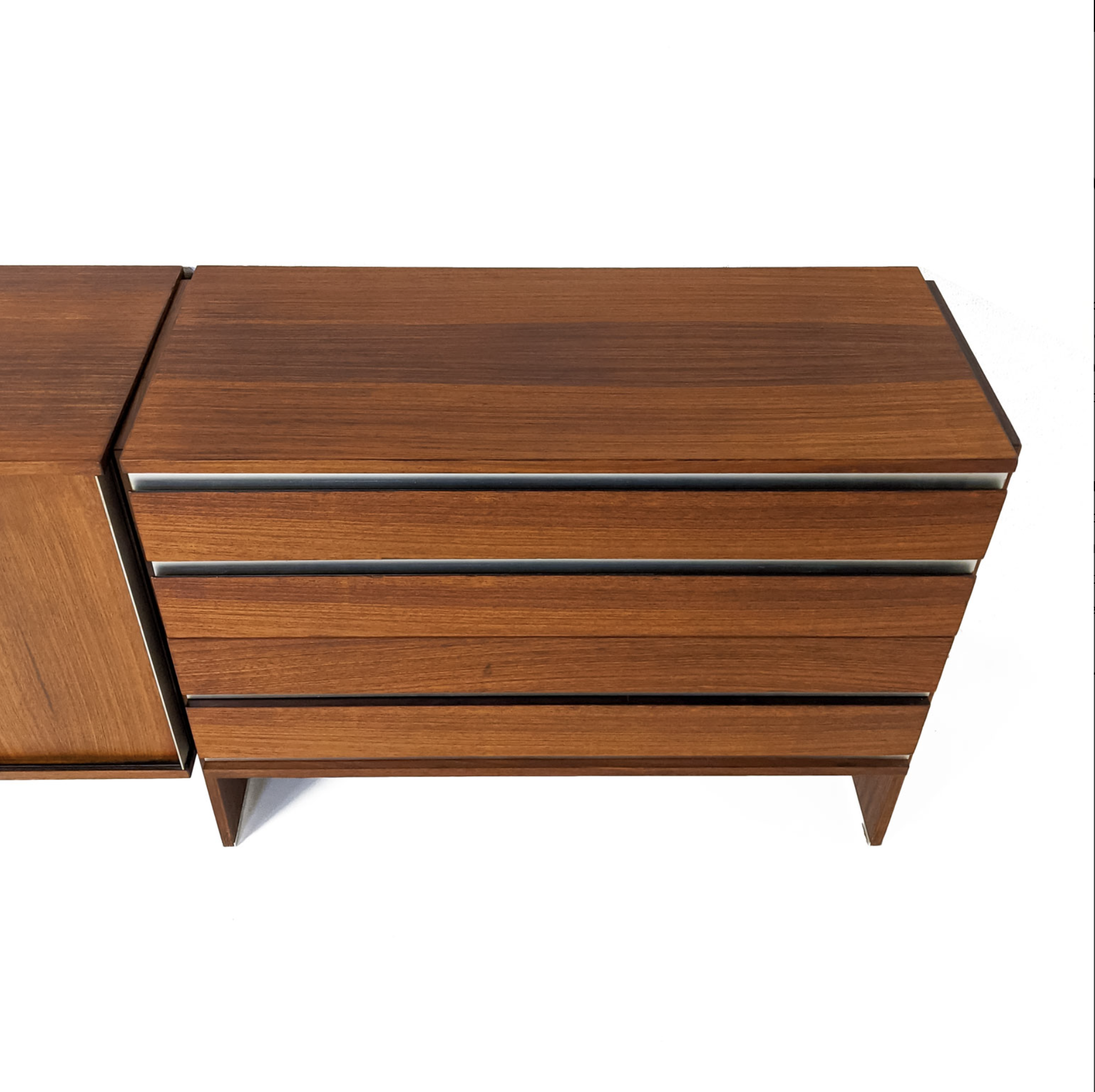 Matériaux : Structure, plateau, portes coulissantes et tiroirs en placage de palissandre et aluminium