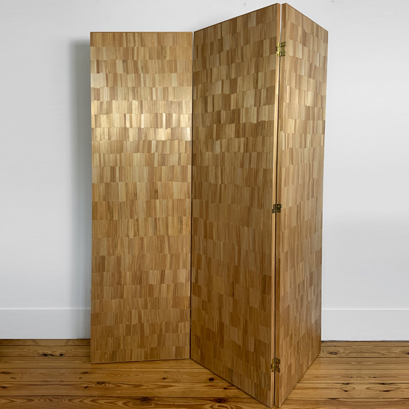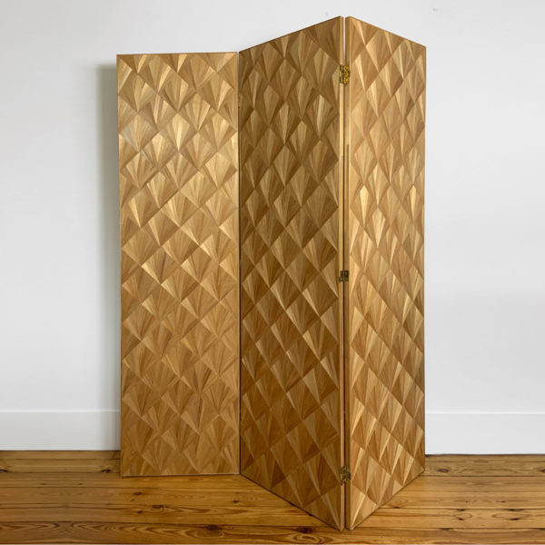 Matériaux : Marqueterie de paille avec motif d’éventails d’un côté et de baguettes aléatoires de l’autre.