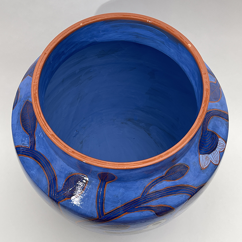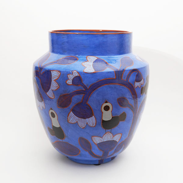 Grand vase émaillé bleu, gris et noir, décoré de motifs d’oiseaux, de fleurs et de feuilles. Une pièce unique réalisée à la main en céramique rouge, signée Béatriz Garrigo.