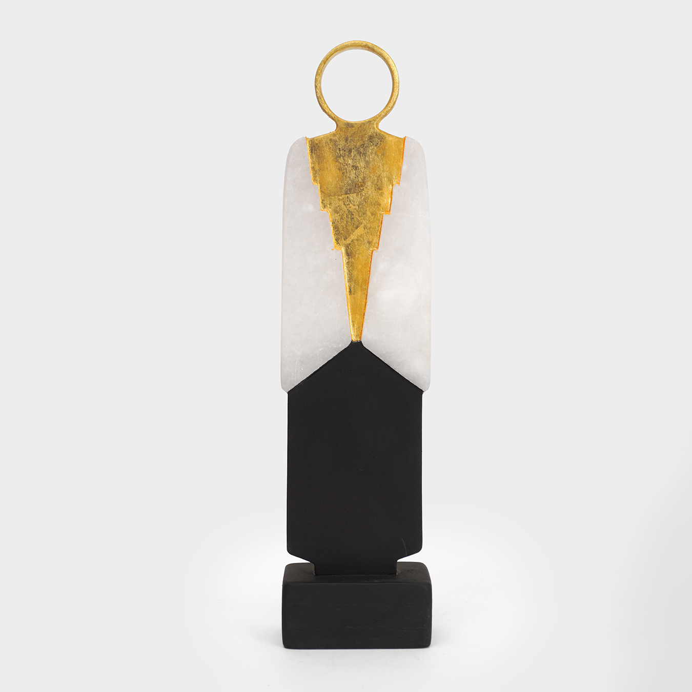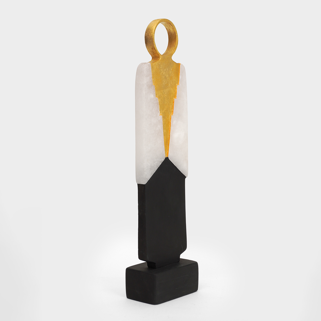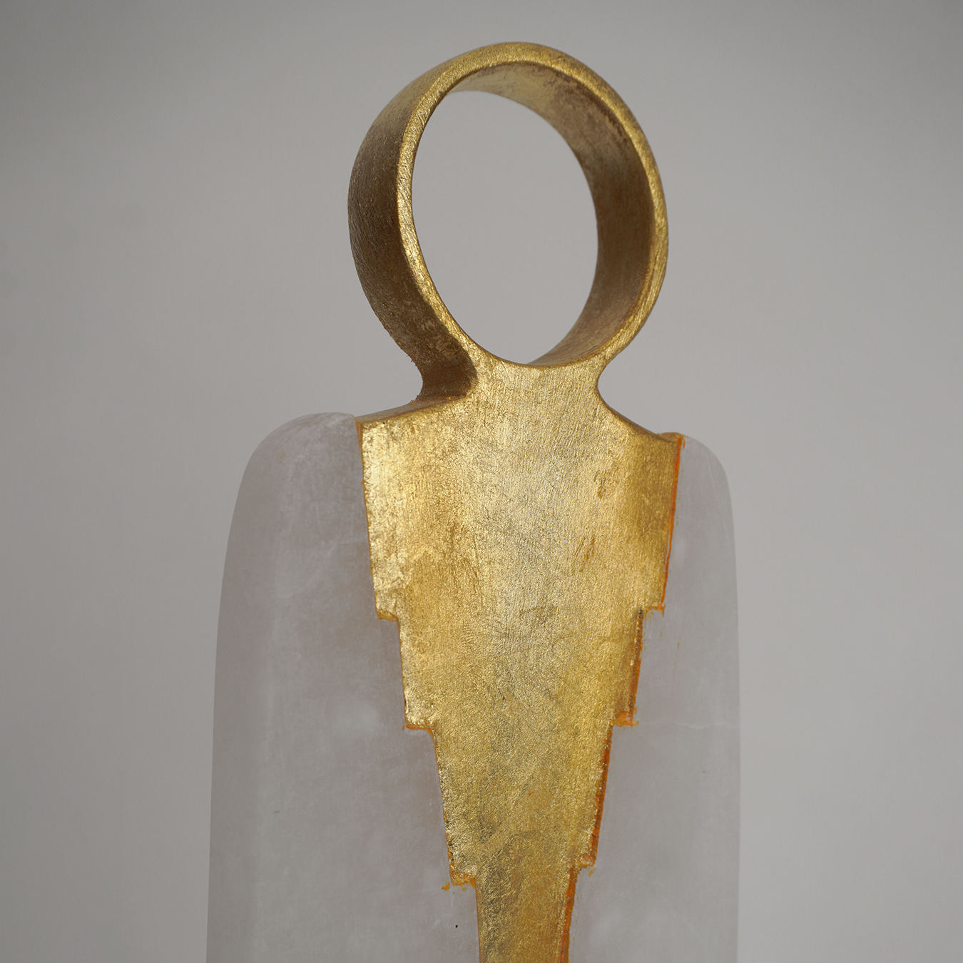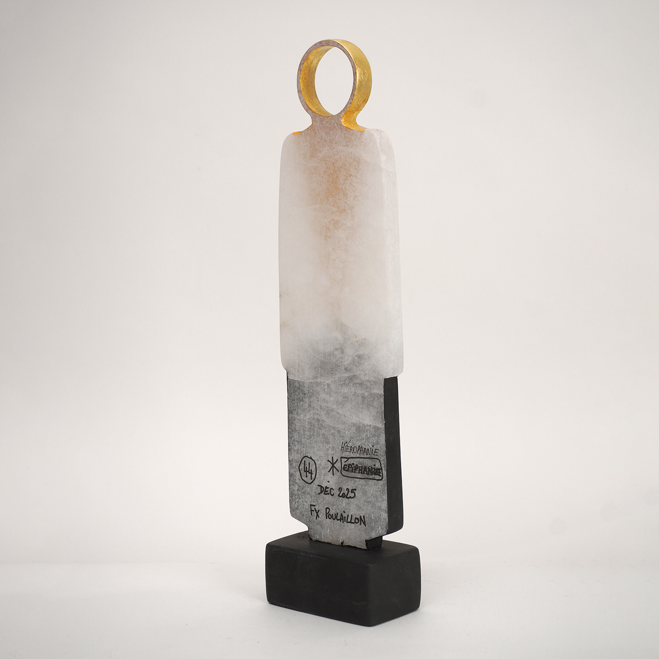 Inspiration : Avec Hiérophanie, François-Xavier Poulaillon évoque la manifestation du sacré dans la matière. La pureté translucide de l’albâtre accueille une forme de lumière incarnée par la feuille d’or, qui semble jaillir du cœur sombre de la sculpture.