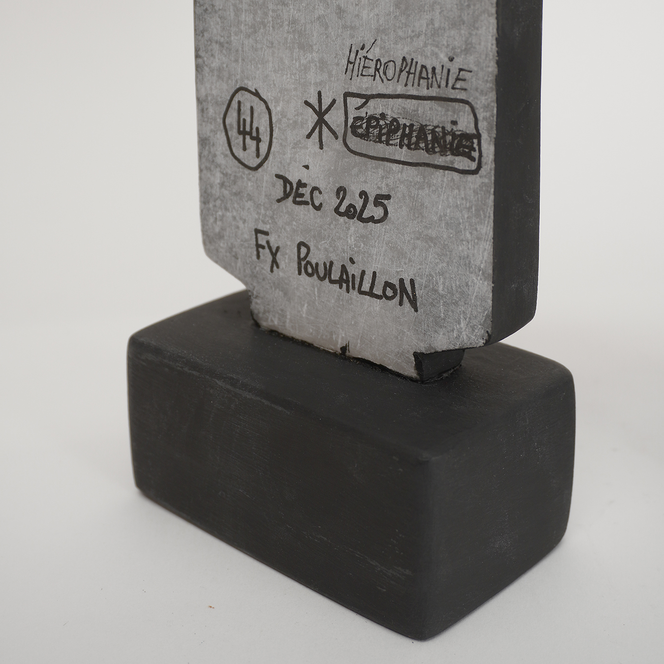 La composition verticale, proche d’une figure stylisée, suggère une présence silencieuse et méditative. L’or irradie comme une révélation, traversant la pierre pour signifier l’apparition du sacré au sein du monde visible.