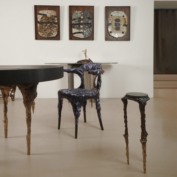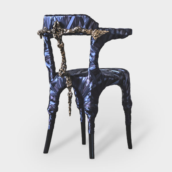 Inspiration : “Cette collection hybride est née d’une collaboration unique avec l’artiste française Rebecca Plisson. Sa pratique singulière consiste à recycler des bretelles de soutien-gorge abandonnées par l’industrie de la mode pour envelopper et redonner vie à des objets oubliés. Fasciné par ce savoir-faire hors du commun, j’ai voulu associer mon travail du bronze à la technique audacieuse de mon amie. Pour ce projet, nous avons déniché quatre anciennes chaises de bistro françaises, que nous avons restaurées en conjuguant nos savoirs respectifs. Le processus de restauration visible est devenu le coeur de notre démarche—une célébration de l’imperfection et de la transformation. Au fond, cette collection est une oeuvre de mémoire, où ce qui est habituellement dissimulé est volontairement révélé pour insuffler une nouvelle âme à chaque pièce. Elle explore le lien entre artisanat et réinvention, mêlant passé et avant-garde pour créer une esthétique résolument hors du temps.” William Guillon