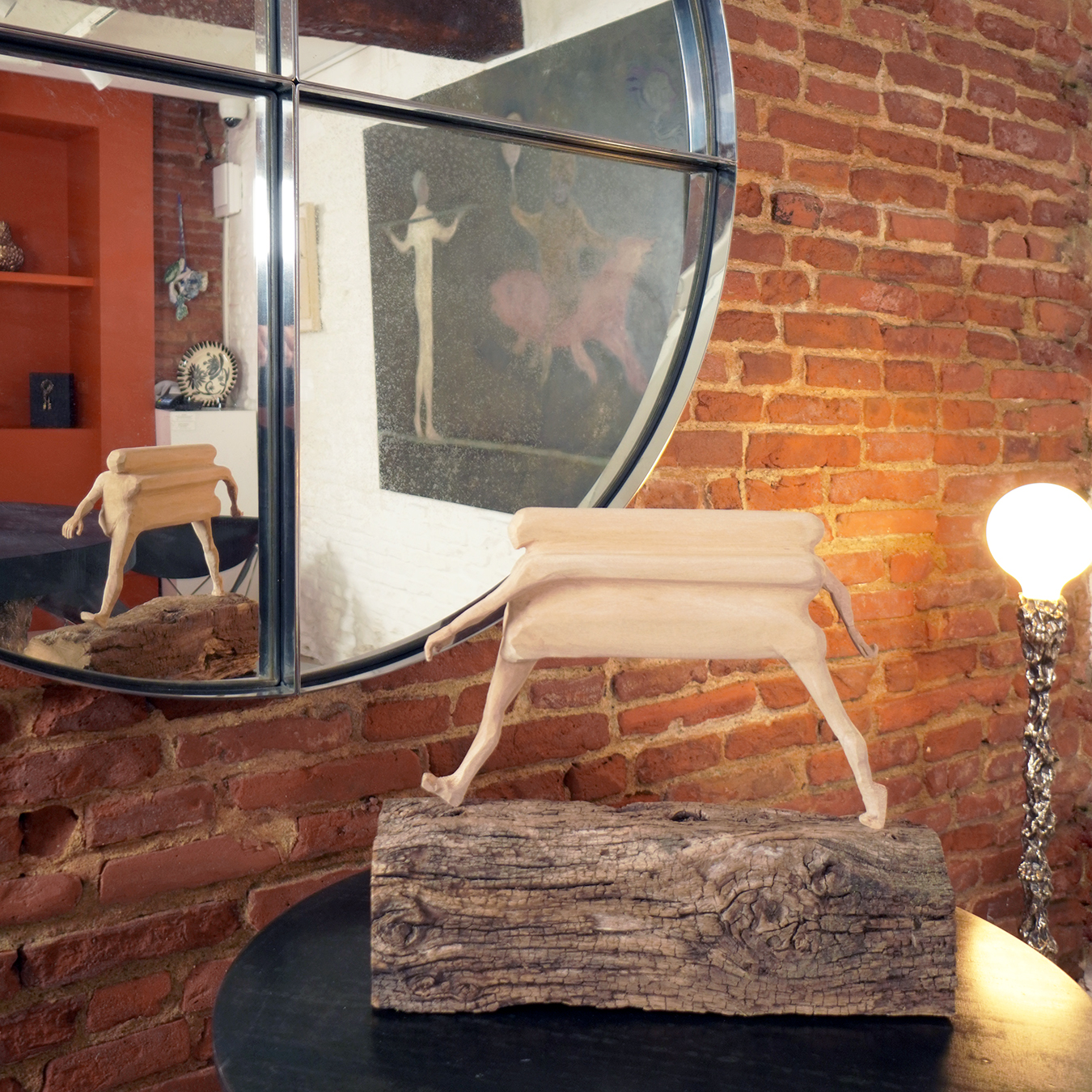 Inspiration : “S’il est une chose que je cherche sans trop savoir où la trouver c’est la seule vérité qui vaille : celle que l’on se doit à soi-même. Mon travail interroge sur notre condition d’humain, sur nos questionnements et sur le courage de les affronter. Il ne me semble pas d’autre chemin possible que celui de la sincérité au premier degré, il faut être essentiel, évident, et mes pièces sont dénudées jusqu’à traduire une vérité existentielle dure et sans fard. Je ne laisse que le nécessaire, je conceptualise jusqu’à la question sans un mot de trop. Mais si le fond est lourd, la forme est légère, brute, franche et sans détour. Ainsi si la vie nous enlève le superficiel pour nous apparaitre crue et cruelle, j’enlève des copeaux de bois pour laisser la matière exprimer sa vérité. Les erreurs y sont écrites, les coups de lame, ceux qui nous façonnent. J’enlève ce qui est en trop jusqu’à ce que nos yeux ne puissent plus ignorer la question posée. Et la pièce est finie, je n’ai pas de réponse. À ma grande surprise il m’apparait alors que la vérité nue est une poésie.”