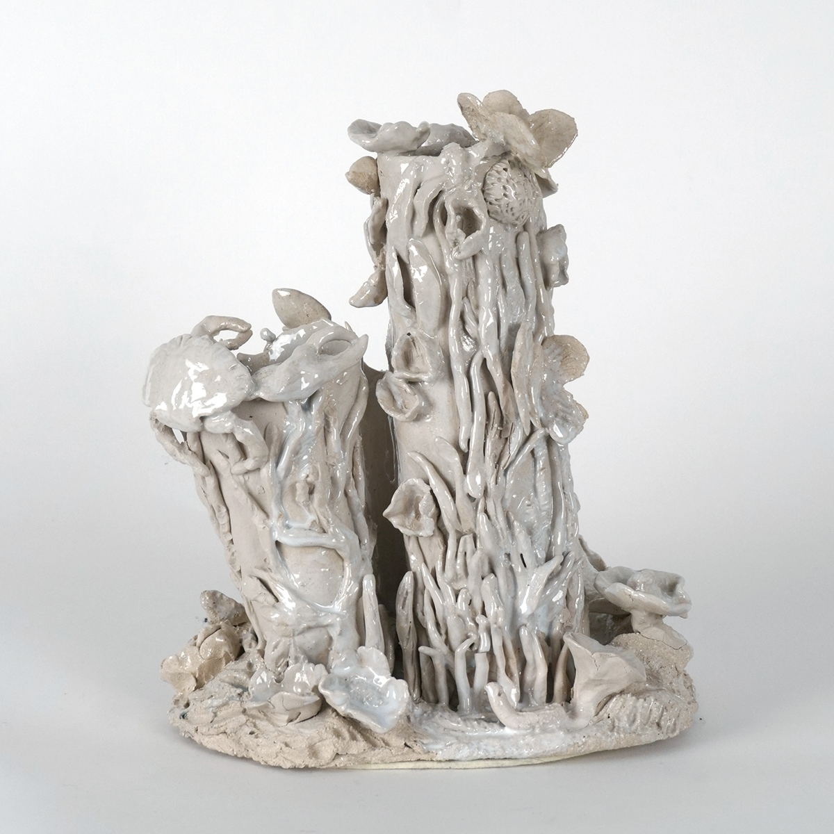 Vase double en grès blanc émaillé de Catherine Blanc inspirée d’un sous-bois mêlant faune et flore dans une composition sculpturale sophistiquée. Pièce unique.