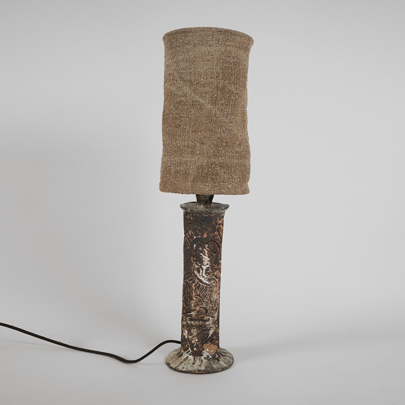 Lampe de table en grès émaillé à haute température et son abat-jour en toile de lin ancien. Dans son atelier du Jura, Pierre Casenove crée des pièces uniques, brutes et fascinantes, qui révèlent la beauté de l’imperfection, de la simplicité et de la nature.