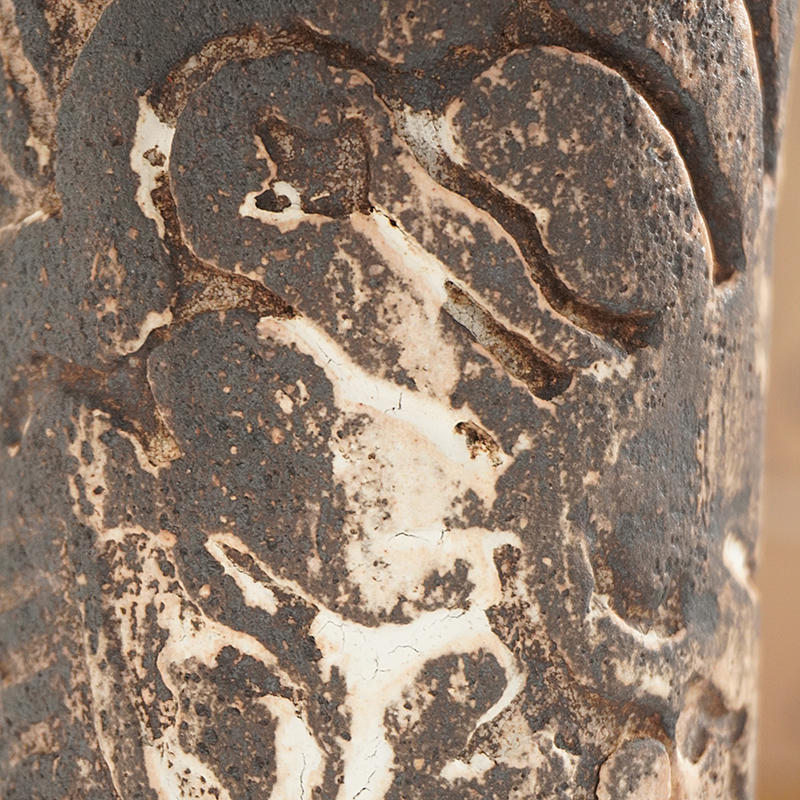 Fabrication : Cuisson à haute température (1400°) pendant trois jours dans un four à bois japonais (Anagama ou “four dragon”). Les cendres végétales sont utilisées à des fins de glaçure. Les émaux cuits à très haute température apportent couleurs et textures uniques à chaque pièce