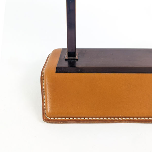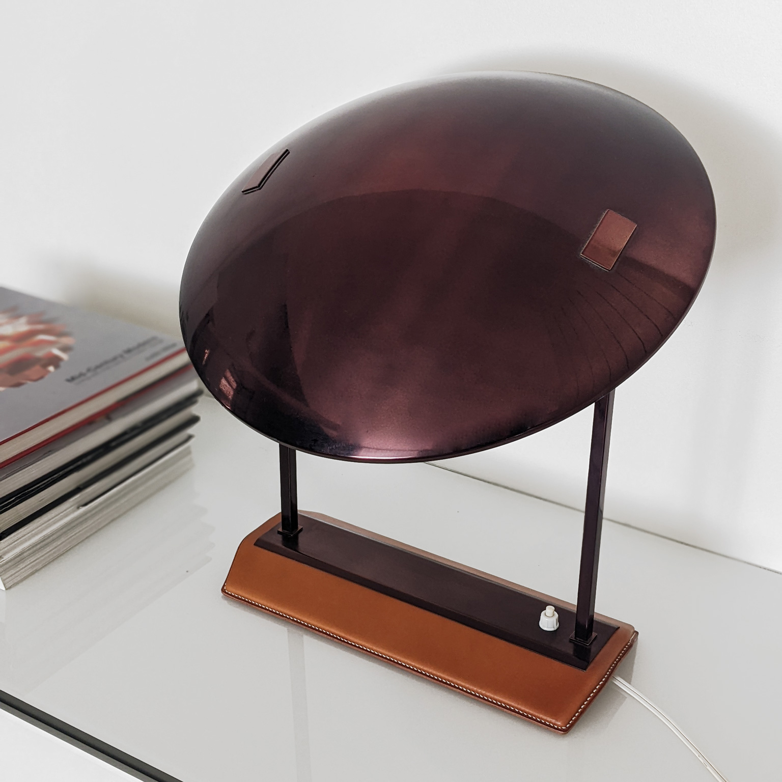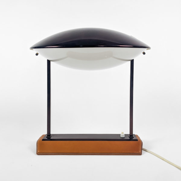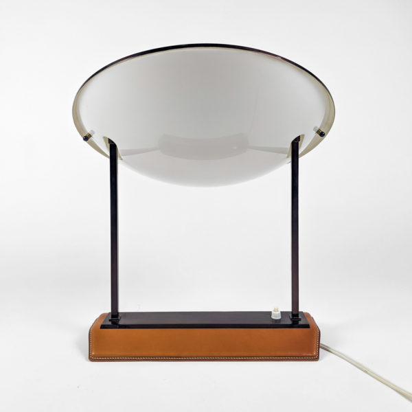 Matériaux : Base rectangulaire gainée de cuir gold, structure en métal soutenant une coupole inclinable, déflecteur en Perspex blanc